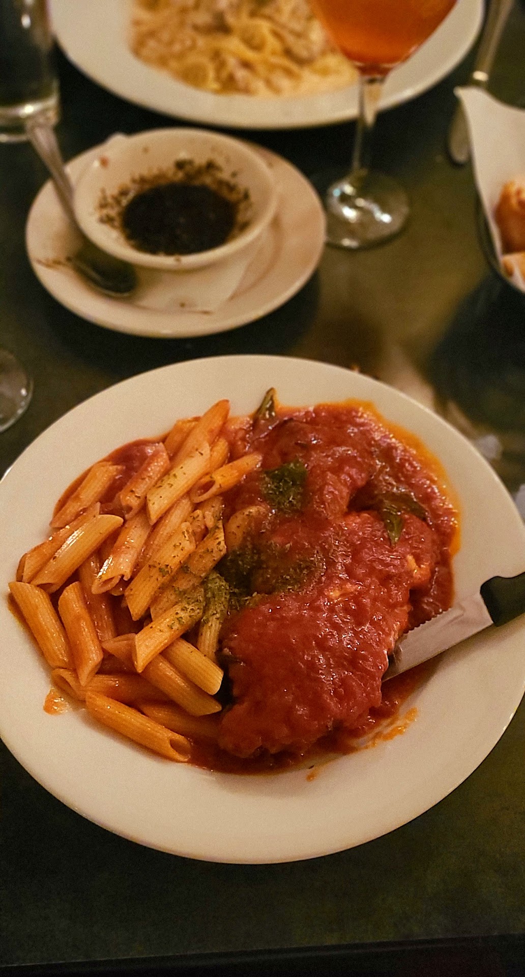 As far as the food, the warm crispy bread with the dipping oil was so addicting to it, I couldn't stop. We ordered the bruschetta as well and I'm glad I got a 2piece because the pieces of bruschetta are HUGE. And to no surprise these were amazing. For the main meal, I got the chicken parm. This chicken just melts in your mouth it's so tender and cooked to perfection along with the sauce all on it and on the pasta. Top notch chicken parm, my favorite chicken parm anywhere. My girlfriend got the fettuccine Alfredo with chicken and like my chicken, it melted in your mouth. This dish also didn't taste heavy like some Alfredo dishes are.