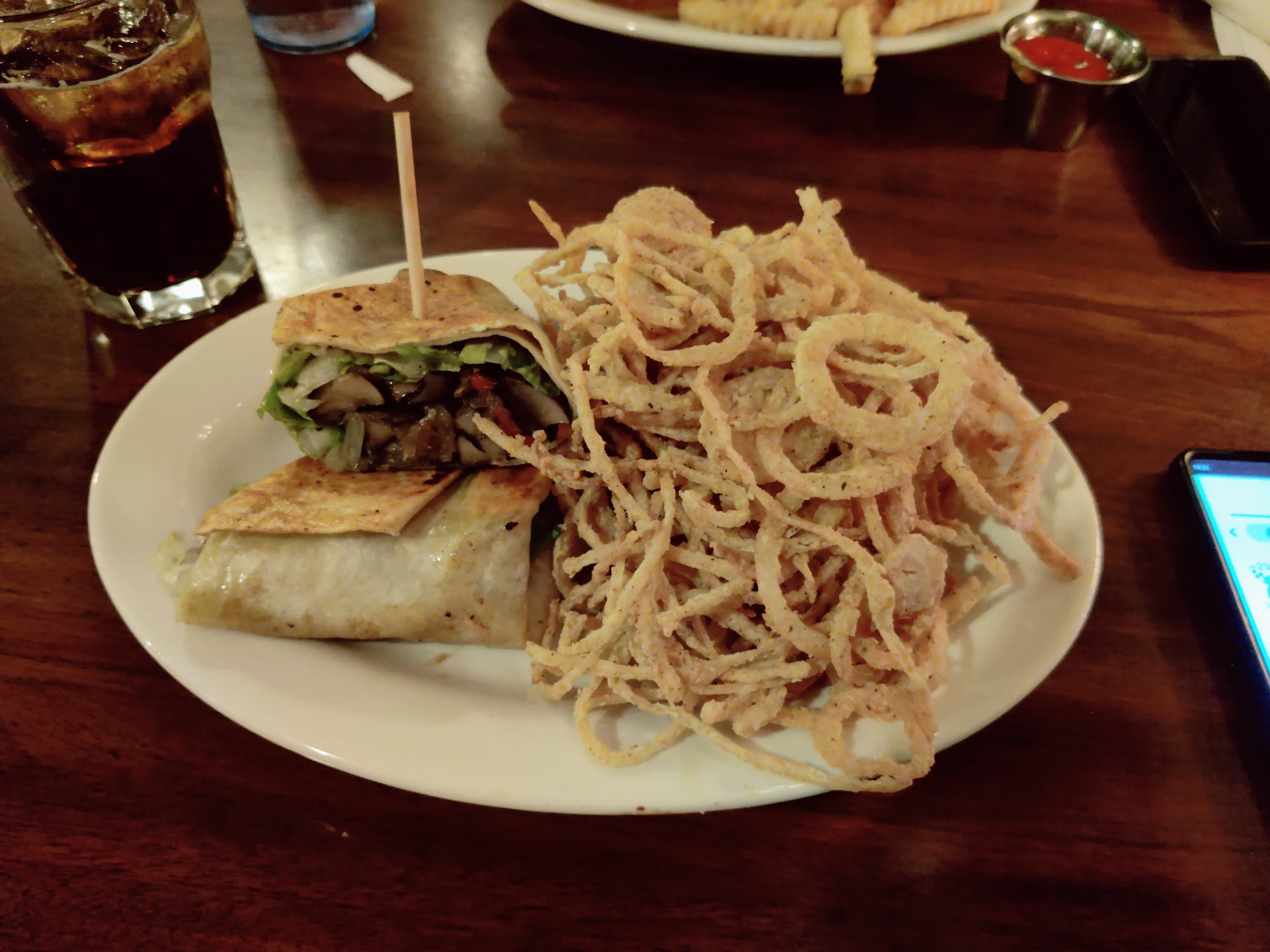 Food: Food here is excellent in my opinion. The wraps and sandwiches they have are quite nice and the apps are insanely good. The nacho dish is massive, so it's definitely worth the cost and you'll probably be full for 2 people. The calzones are a huge upset and are way too overpriced. I once got one to try and there was only filling in the middle, about half of it is just just cheese and breading. It was somewhere around 26$ and honestly didn't fill me. Pass on these unless you can't eat anything else. The chicken sandwich is like a Chick-fil-A sandwich on crack, definitely try it! They have a pork belly sandwich, it wasn't bad but wasn't good either. Most other items in the menu are pretty good though. Very good and interesting selection for specialty pizza, you'll be stuck between 3 or 4 that you'll want to try for sure. Prices for food are a bit high, but the quality is very good. If you get a sandwich, add the onion rings for $2 and you won't regret it. They have some really unique onion fries/rings!