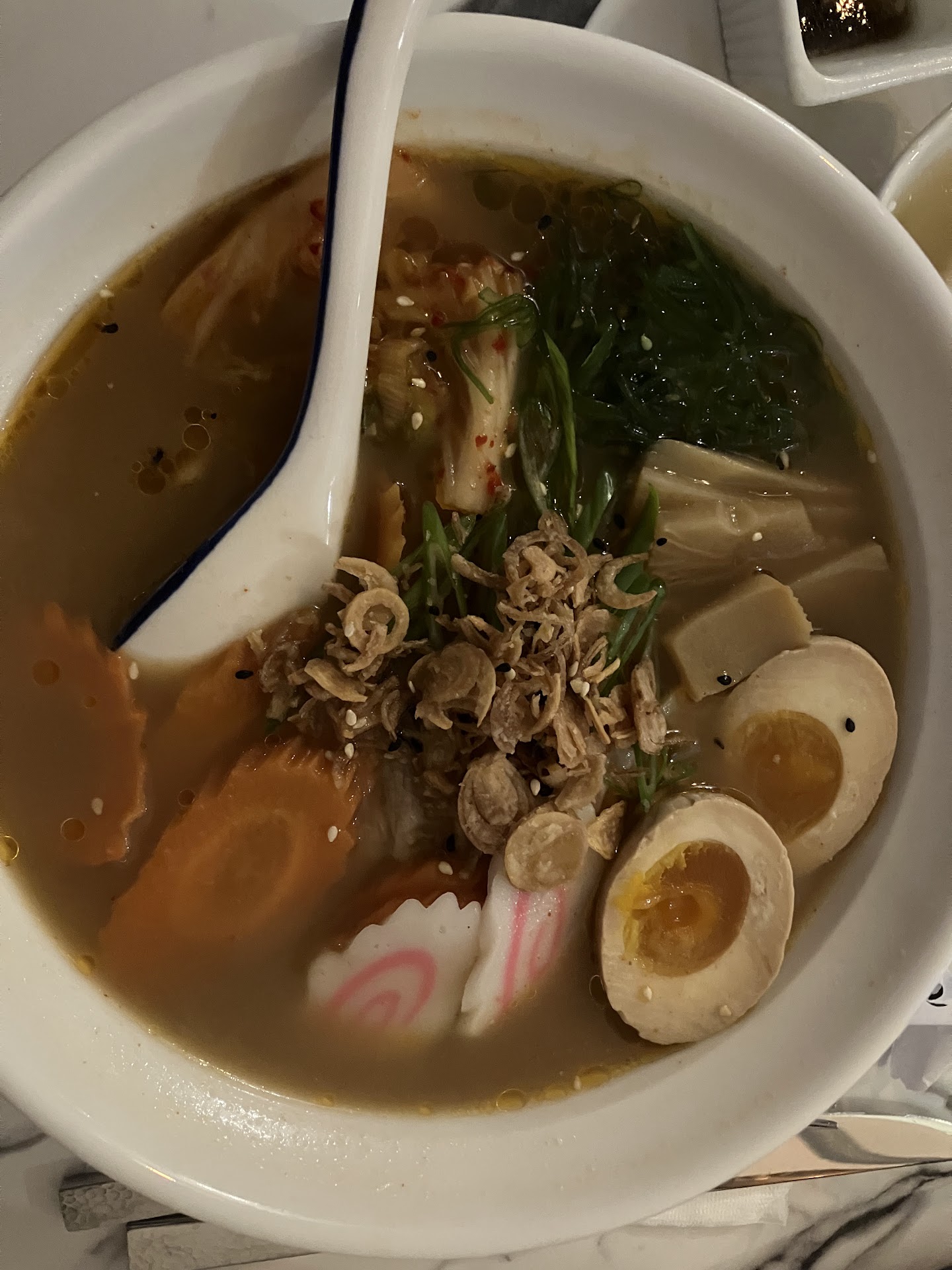 Read morePlace is so beautiful on the inside they really did well with making a small space luxurious. The service is great very attentive. Music playing a created a good vibe. Food was great I got spicy tonkatsu and wow a creamy ramen broth filled with everything you could want in ramen and more. Food cam out quickly which is what I hoped for my daughter was at karate I had exactly one hour I was in seated and left happy within an hour(I was alone). I also got the soup dumplings which is a must. Four dumpling in individual cups and a delicious broth with a side sauce . Wow I ate all four on my own and barley had room for my ramen ( which I got to go and tasted great to go also). In the future I know Ill be back. They have a cute round table with what looked like a spinning middle piece to share food that looked like a fun idea if u...