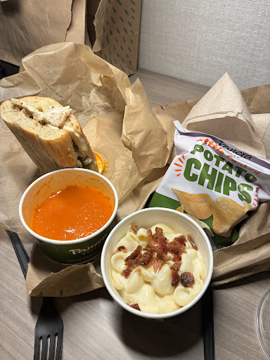 Read moreI go to Panera fairly often, at least 10 times this year; let me start off with saying I enjoy going to places more northern in the world, so that goes to say that my experience at Panera this particular location was very pleasurable. When I entered with my two other coworkers they finished and then as I was speaking to the young lady Jessica at the cash register she was so warm hearted and just very wonderful to talk to you! I think she should be givin a promotion and a reward for her outstanding service; she was able to vary intellectually and intuitively. Repeat my order back to me and she took down my phone number for my free sweets reward when she asked where my 717 area code resides in I kindly responded that it’s from the Pennsylvania Hershey area and she was nice enough to let me know that I have a nice accent which made me feel so full of joy and I almost forgot to go straight to the father in heaven for that wonderful praise that I received through such a kind hearted person! I ordered the chicken pesto and tomato dipper. I also ordered the French onion dipper with steak sandwich and the fireside chili. I included pictures below. The sandwiches are fair in their portion sizes and tasty. I very much so enjoyed the tomato dipping sauce it actually went much better with my mac & cheese with bacon on top. I also got my usual which is a cranberry loaf, which was good as usual although the fire side chilly was a bit more thin than I expected, but I do understand that Panera most likely puts most of their soups through food processors, and the chili stuck to its name by being very, very hot in temperature a.k.a. fireside chili, the atmosphere there was nice and I hope that all the hands that prepared my meal...