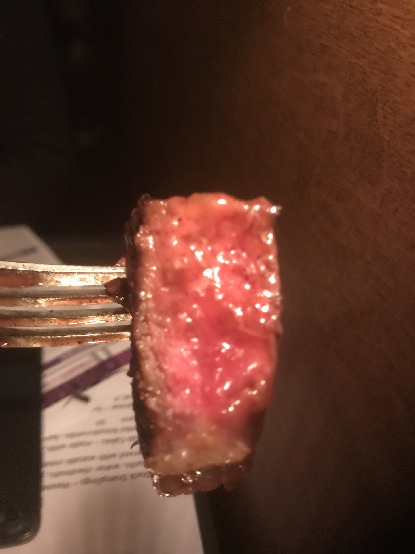 Our entrees later arrived -- 8oz strip steak and house burger with blue cheese topping. We were really disappointed with both dishes. The steak was not very hot , not very tender, the au poivre sauce much too spicy and the burger was cold. We chose to send just the burger back. We had asked for it medium rare but it was cooked beyond that but yet cold. The served offered to make us a new one and we agreed but we were truly shocked when she returned with the original burger with the bite marks clearly visible( we had asked for the burger originally to be split into two so we each had taken a bite). At this point the server comped us for the burger and we left what should have been a nice wedding anniversary dinner very disappointed with the food though the staff are very nice. We think this place may be really suffering from a downturn in business as we heard a staff member saying that business is down compared to last year to a different customer. Also I think our food suffered from being lost in the shuffle of the larger party. In any event, the prices are high enough that this restaurant needs to do...