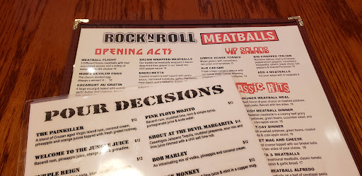 Read moreMy goodness what a great concept! For a person who is NOT the biggest meatball fan they really impressed me! Let me start with the atmosphere - rocking tunes, sing alongs and all from your favorite rock bands. All sing alongs I must say (maybe it's just me), G'N'R, Bon Jovi, Motely Crew etc. Cool art of Dimebag, Lemmy, Freddie and the like. Drinks were tasty and I just loved the names. I got Purple Reign and my sister got the Bob Marley-They didn't disappoint at all! They had zing if ya know what I mean 😉 Food was great! I literally finished my entire plate! I got the brisket meatballs with cavatappi pasta and cheese with quad fries seasoned perfectly and a Cucumber salad for sides. The brisket brown gravy had just the right amount of salt and savory flavor. Meatballs were not dry at all (avoiding the M word here) but flavorful and the Cucumbers with dill had the right amount of dill and tanginess I wish I could have had more! My sister had Italian meatballs with pasta, a side salad and bread she said she could marry 😂 Oh, and delivered by a robot-fun! Definitely would recommend, Definitely going back!...