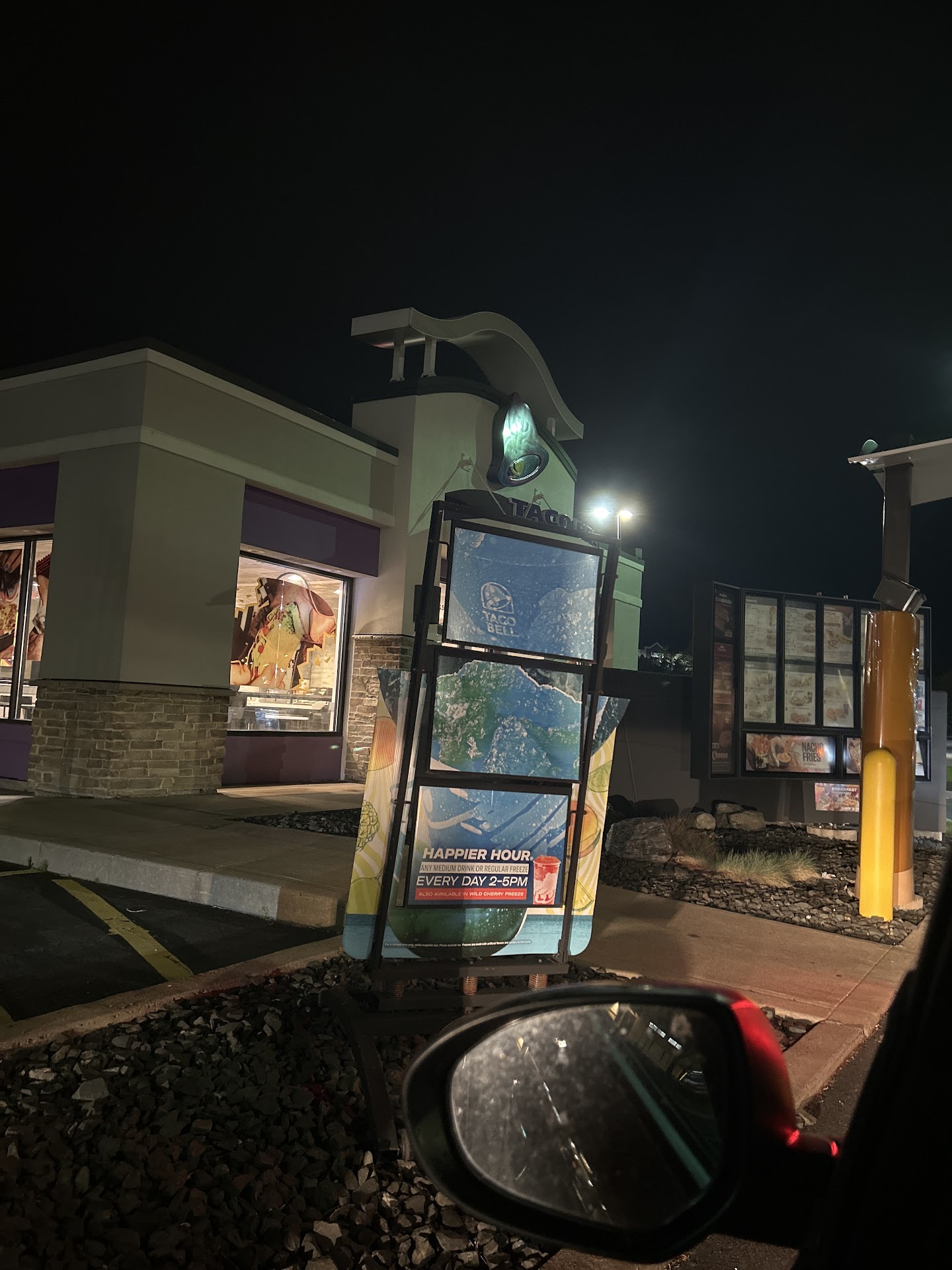 Read moreI went to this location's drive-thru on the evening of Sunday, December 6th, 2020, and received the worst customer service in my life. On a big sign on this location's drive-thru menu, it said FEATURED: GRILLED CHEESE BURRITO. I thought that sounded great so I decided to order it. The woman who took my order said "they don't serve that here, I have no idea what you're talking about." So, I proceeded to read her the menu which said "FEATURED ITEM" and she finally got it after I read it to her about 3 times. I then ordered a cheesy bean and rice burrito, beef chalupa, two soft tacos, and a medium Pepsi, which she also had trouble understanding. I figured she might have not been able to hear me through the intercom but when I read my screen everything was correct so I pulled forward after confirming with her that my screen was my correct order. When I pulled forward she handed me my Pepsi, swiped my card, handed it back to me, and closed the window. She then proceeded to stand in the corner with her arms crossed watching other people work for 15 minutes! Not once did she apologize for the wait or come up to me. There was then a customer acting belligerent, beeping her horn at me, yelling racial slurs, and then even got out of her car and approached the window which can all be seen on video! The woman who took my order stuck her head out and said "whose beeping like that?", giving me an attitude as if it was me and I said the woman behind me! Who was still outside of her car, putting me at risk as she wasn't wearing a mask and screaming at the top of her lungs. After 15 minutes of being yelled at, insulted, and put at risk with absolutely NO employee nor manager intervening, I was handed my food. Which was NONE of the food I ordered. I received a crunchy chicken taco with just chicken and lettuce, a cold chalupa, and a...