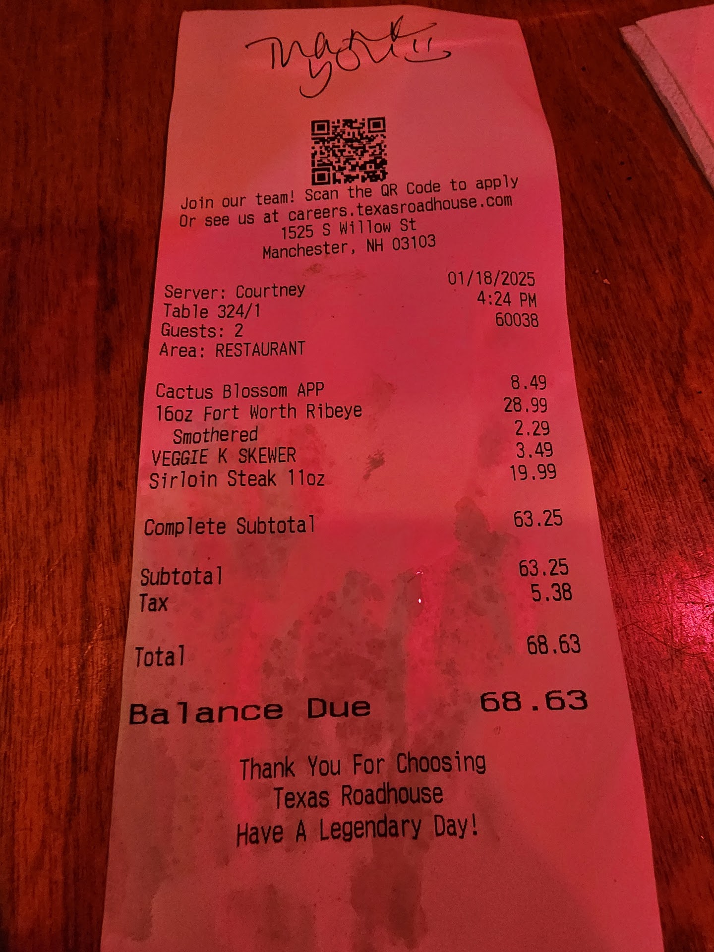 Read moreMy husband and I frequent Texas Roadhouse in general but this was our first and last time at the Manchester location. We decided to do a to go order since we were near by… the to go process was confusing. They have spots reserved for you and you get text they tell you to text here when you are here and make it seem as though someone will be out to you. This was not the case I waited past the estimated time the food would be done and went up to the to go window and it was sitting there waiting for me. I got a text telling me my order was ready when I was 20 minutes into our drive home. My husband and I ordered two filets medium. (Should be a warm pink). My husbands was more a medium rare and was able to get to temp at home (after we had to wait for our oven to preheat). Mine however was so rare it was more like a purple color. As if someone had only seared a raw piece of meat. It took so long to get to medium my husband was done eating by the time mine was no longer rare. Pretty frustrating that I had to wait nearly 30 minutes after we got home to wait between preheating the over and cooking the steak properly. I can usually cook a better filet myself and was just trying to save myself some cooking since its been weeks since we ate out. What a mistake that was, don’t waste your time here. Either go to a different location or get a nice filet at mr steer and londonderry and cook it yourself trust me you’ll be...