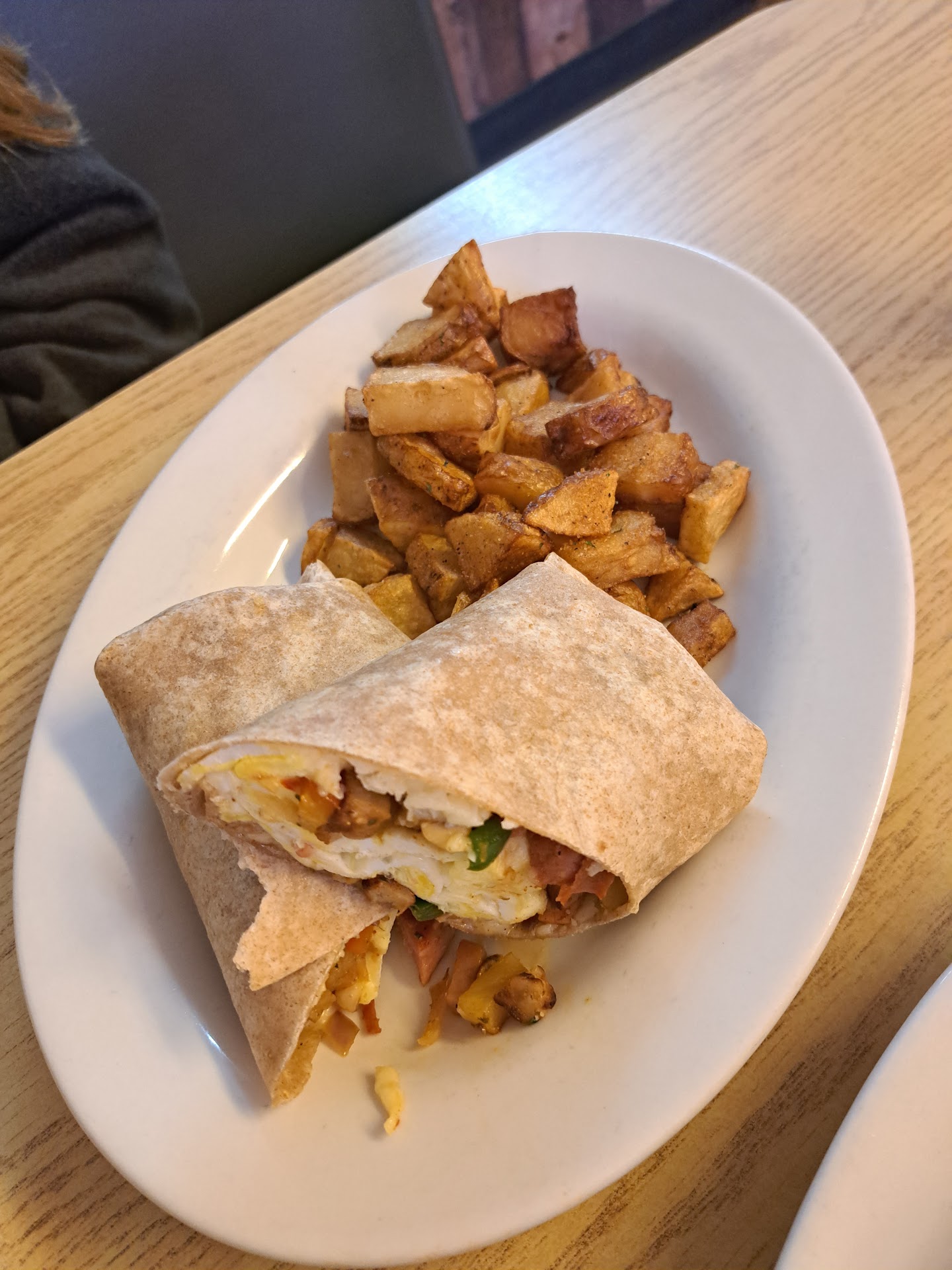 Food: I've had a large portion of the breakfast menu at this point and the majority of it is pretty good. All of the wraps I can highly recommend, packed with flavor and will definitely fill you. Be careful when ordering something with a side of seasonal fruit, it's a complete mixed bag; one time you may get a bunch of mixed fruits with even proportion amounts which is great, other times you'll get a full cup of honeydew and a grape, or a semi-mushy pile of fruit. The 'I'm Hangry' is a massive meal and can definitely feed 2! The pancakes are huge, so beware and be hungry! The omelets are also huge, and can't go too wrong if you want a filling breakfast, 1 omelet meal could feed 2 as well. Every time I've ordered something here there was something that was off. Whether the tater tots were fridge cold, my wrap being sopping wet (egg white veggie wrap), or getting seasonal fruit that is a solid piece of honey dew, mushy, and the list goes on... there hasn't been a single time I've ordered that something ruined the meal. If French Toast was on your mind, I would recommend something else (unless it was a miss the time we got them).