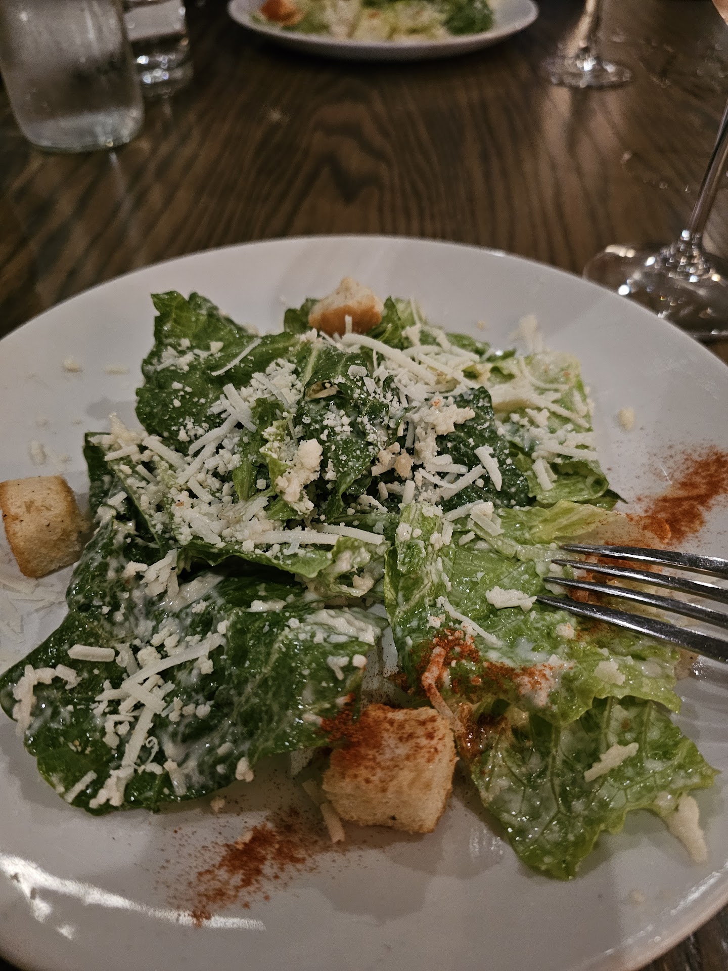 the other two people at my table that were unsatisfied ordered the same thing, which was a caesar salad with added chicken ($22 total) and i promise i am not exaggerating by saying the plate was MASSIVE but the food on the plate was absolutely tiny. there was about six bites worth of salad—which was just lettuce. but they did dump a big patch of paprika on it? which wouldve been fine if it wasnt a big giant dump of paprika on a piece of lettuce??? the chicken (that was $9) was a small grilled cutlet that was so hard to cut through it shook the table when they attempted to cut into it. again, very disappointing. also, my aunt ordered a coke, and the coke had zero bubbles in it. again i wish i was exaggerating, there was no carbonation in this coke. at all. completely flat. upon asking for a replacement, stating it was flat—she was brought yet another completely flat soda. again not a single bubble in this soda, and tasted watered down. again very disappointing.