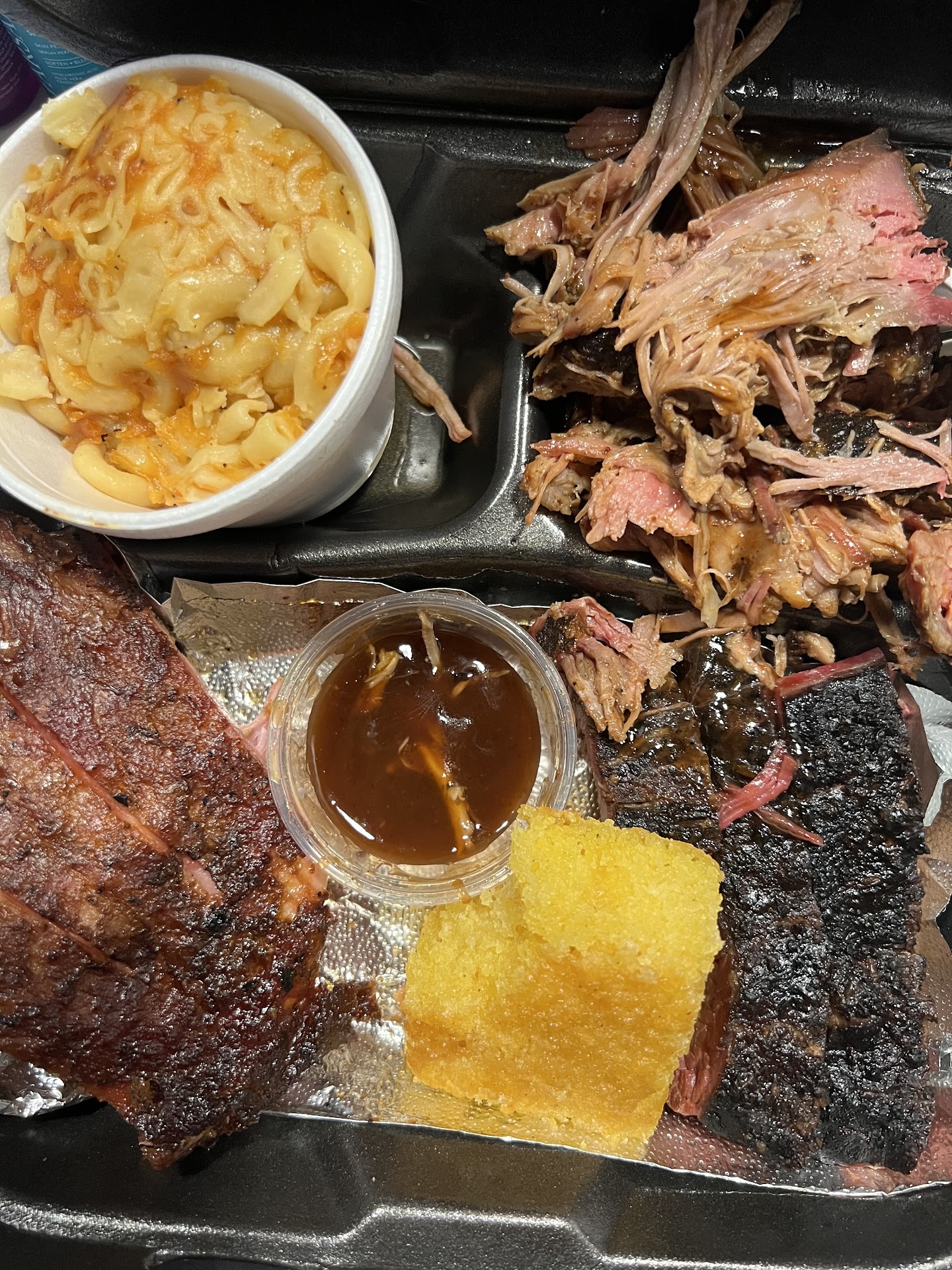 Read moreTried this place out for the first time today and was very pleased with their offerings. Ordered a pound each of pulled pork and brisket, along with a full rack of ribs, and side orders of collard greens, beans, and cornbread. The pulled pork was moist, relatively lean, and tasty. The order of brisket had slices from both the point and flat cuts; the former is juicier but has more fat, while the latter is leaner and a little more chewy. They both were tender and had a good smokiness. But the ribs were the star of the night -- the outside had a crisp spice rub which gave them a real zing. They were smoked to the point of being tender, not falling-off-the-bone (which I think is too much) and still had a nice chew to them. Collard greens were fresh, leafy, not at all bitter or overcooked, and had a tea-like perfume; beans were nicely seasoned with a molasses sweetness; and the cornbread was chewy and moist with a good crumb.