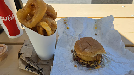 Burgers are delicious and they are tasty. Not salty or greasy. I had a cheeseburger and my husband had the green chili burger. We also shared the chili cheese fries with green chili on top. Green chilli is mild not spicy at all. The price for this meal came out to $28.94 including drinks. Definitely worth it. You also have the choice of ordering at the window or self service kiosk. There is a dog friendly area separate from the main canopies. Drinks are self service. I forgot to take a picture of the food because it was...