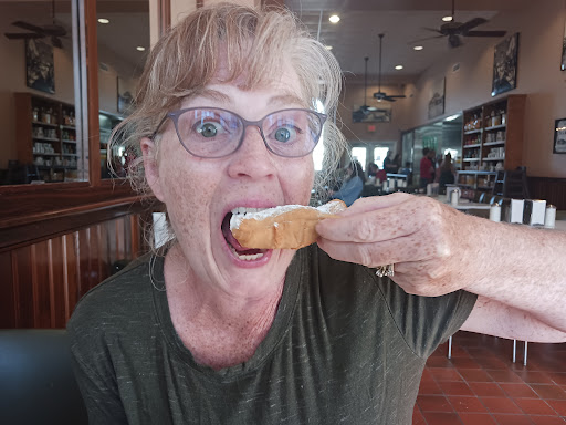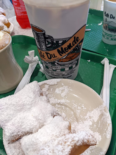 Read moreMy nesting partner has always told me I needed to visit Cafe Du Monde. Since we are down visiting family we all went. Omg these beignets are absolutely delicious. They're airy doughnuts covered in powdered sugar. Also got an iced mocha au lait which has a bitter and sweet taste - doesn't make me think of chocolate tho (referencing mocha) however it's delicious and I do like my coffee to have a bitter taste. They had catalogs on each table and there's a wall of cups, coffee, beignet mix, and gift baskets with combos that are cute and fun to have. They even have giant coffee mugs. We got a can of chicory coffee as our car is already pretty full of stuff...