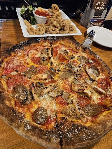 We ordered a beer, pizza and calamari. For starters, the calamari was a huge serving and fried to absolute perfection. So crispy and tender, one of the best I've ever had and I've had them at many places. By the time I took the picture, we had eaten half the order of calamari.