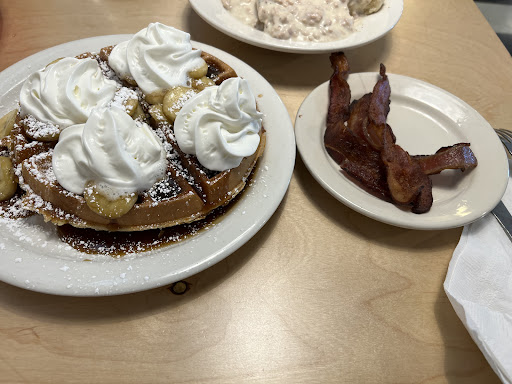 I had the Bananas Foster Waffle with a side of bacon. My husband had a stack of regular Pancakes and a double order of Biscuits and Gravy.