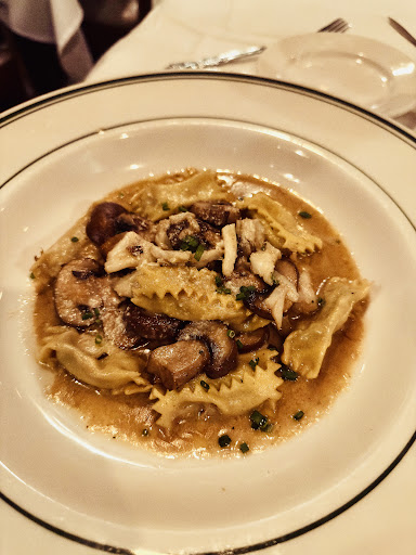 For our entrées, I had the Pork Tomahawk Chop, which was juicy, tender, and cooked to absolute perfection, served with rapini and a bold salsa verde. My wife ordered the Stuffed Agnolotti Pasta with wild mushroom and lump crab meat, and it was rich, delicate, and absolutely unforgettable.