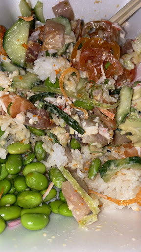 The gentlemen at the table ordered poke bowls that looked fantastic, but the seared pepper tuna salad I ordered was awful. It came on a dirty plate and the inside, "rare" part of the tuna was dark brown, not the pink or flesh colour of untreated fresh tuna. It was obviously oxidized and smelled old. I caught the attention of the server and she tried to tell me that it's because the tuna is seared, but I know what seared pepper tuna is supposed to look and smell like. Please look up pictures of oxidized tuna. It's not fresh. I tried to be very polite and not act like a "Karen," but I just couldn't eat it, so I quietly said "thank you" and ate my sushi roll.