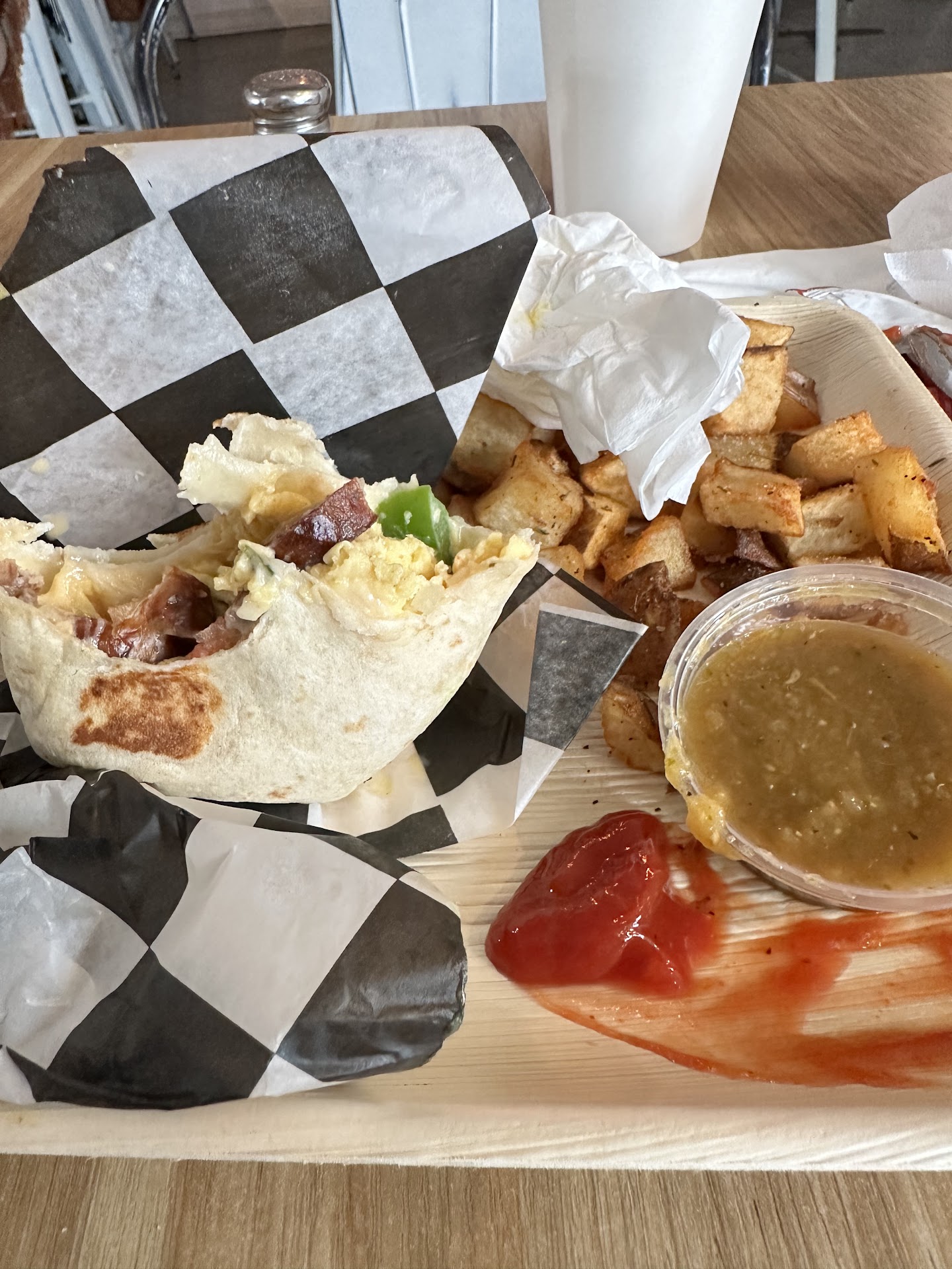 Breakfast burrito was probably the worst burrito I’ve ever had. Frozen grocery store burritos have better flavor and likely healthier than this. Raw bell peppers overwhelm and pretty sure I tasted mayonnaise. Salsa was flavorless (so I tried some ketchup to give it some flavor). Potatoes come with the dish I’m pretty sure they’ve been sitting under a light for the past hour to stay warm (no crunch or flavor here either).