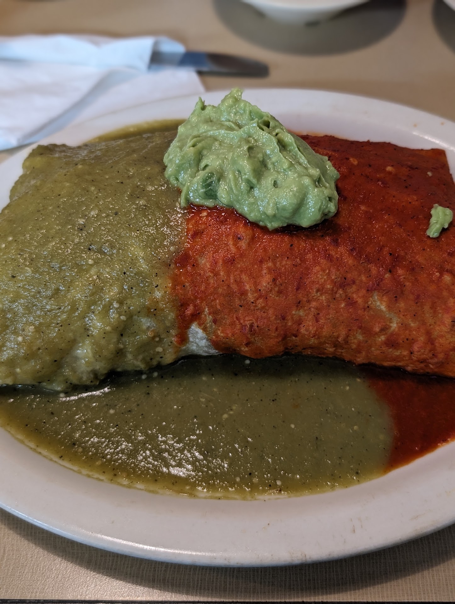 Service was top notch but I dont go to a restaurant for the service. I go for the food. I think a lot of the reviews on here forget that. 😕 The food was extremely bland. I bet money none of the workers eat here. Even if they get a free meal. I took their recommendation and tried the pork burrito. The red sauce it was topped with was bad 👎. The red sauce alone 😔 was too much for me. I couldn't even taste the cheese. There just wasnt enough it. Dash of cheese. Big mistake. Lots of pork. Topped with a good amount of guac. The burrito is a perfect large size. Unfortunately th pork was bland and tastless. Oddly the red sauce at the bottome of the dish was ok. The hot lettuce inside the burrito is strange. Hard pass. Wont be coming back. Great staff though. Old 90's microwave style...
