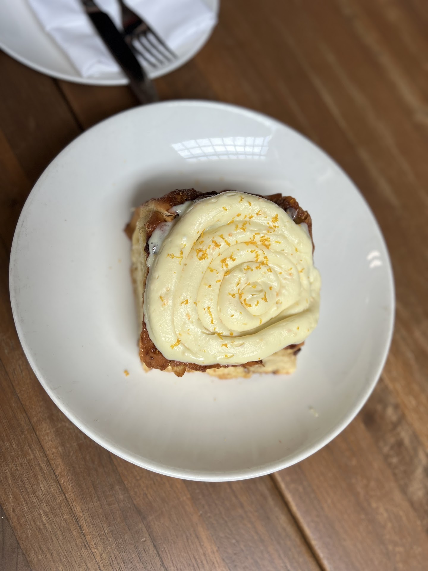 Cinnamon roll (my friends order) 3.5-5 /5 Warm spiced brioche smothered in citrus marscapone icing ~The roll was huge! It was a glaze with citrus rind sprinkled on top. I thought the citrus was a nice touch, but thatâs because I donât love cinnamon rolls because I find them too sweet, so the citrus does a nice job breaking up the sweetness. One of my friends loved this. She said the roll was delicious. My other friend said this was meh. He said the roll wasnât hot enough and that the citrus took away from the usual cinnamon flavor. Then again, his caveat is that he isnât a huge sweet person, although he does like cinnamon rolls.