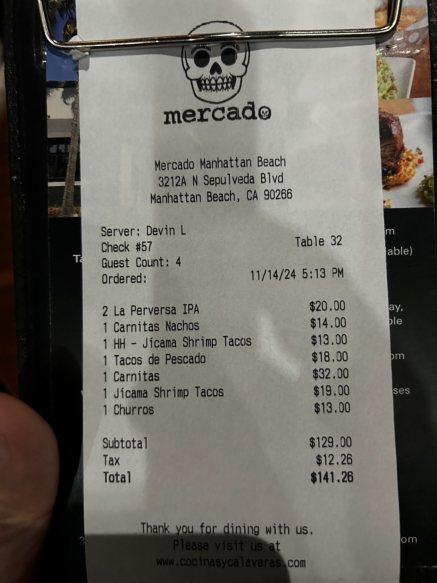 Ā Ā Ā Read moreThe Service: Alright, let's dive into my latest visit to Mercado in Manhattan Beach. I've been here a bunch of times, but this visit? It was something else, all thanks to our server, Matt. This guy knows his stuff and makes you feel right at home from the get-go.
