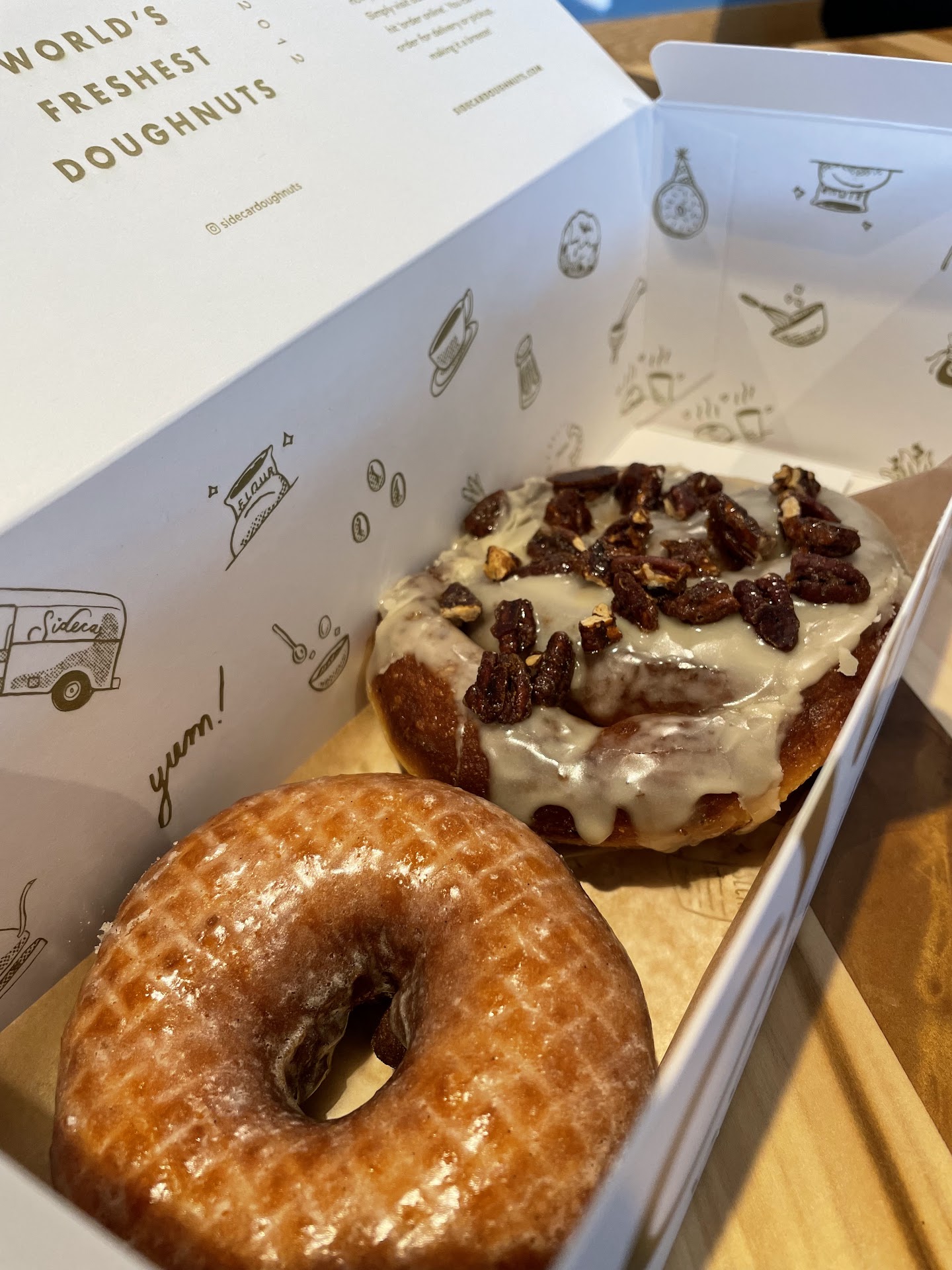 The olive oil citrus had this delicate, bright citrus zing paired with a subtle, fragrant olive oil that made it feel almost sophisticated yet so comforting at the same time. The old fashioned was a perfect classic: slightly crisp on the outside, tender and moist inside, with a nostalgic flavor that hit every note just right. And the huckleberry? Was sweet, tangy, and deeply fruity, wrapped up in a beautifully balanced glaze. It felt like we were eating pancakes yum! If you’re anywhere near Sidecar, go...