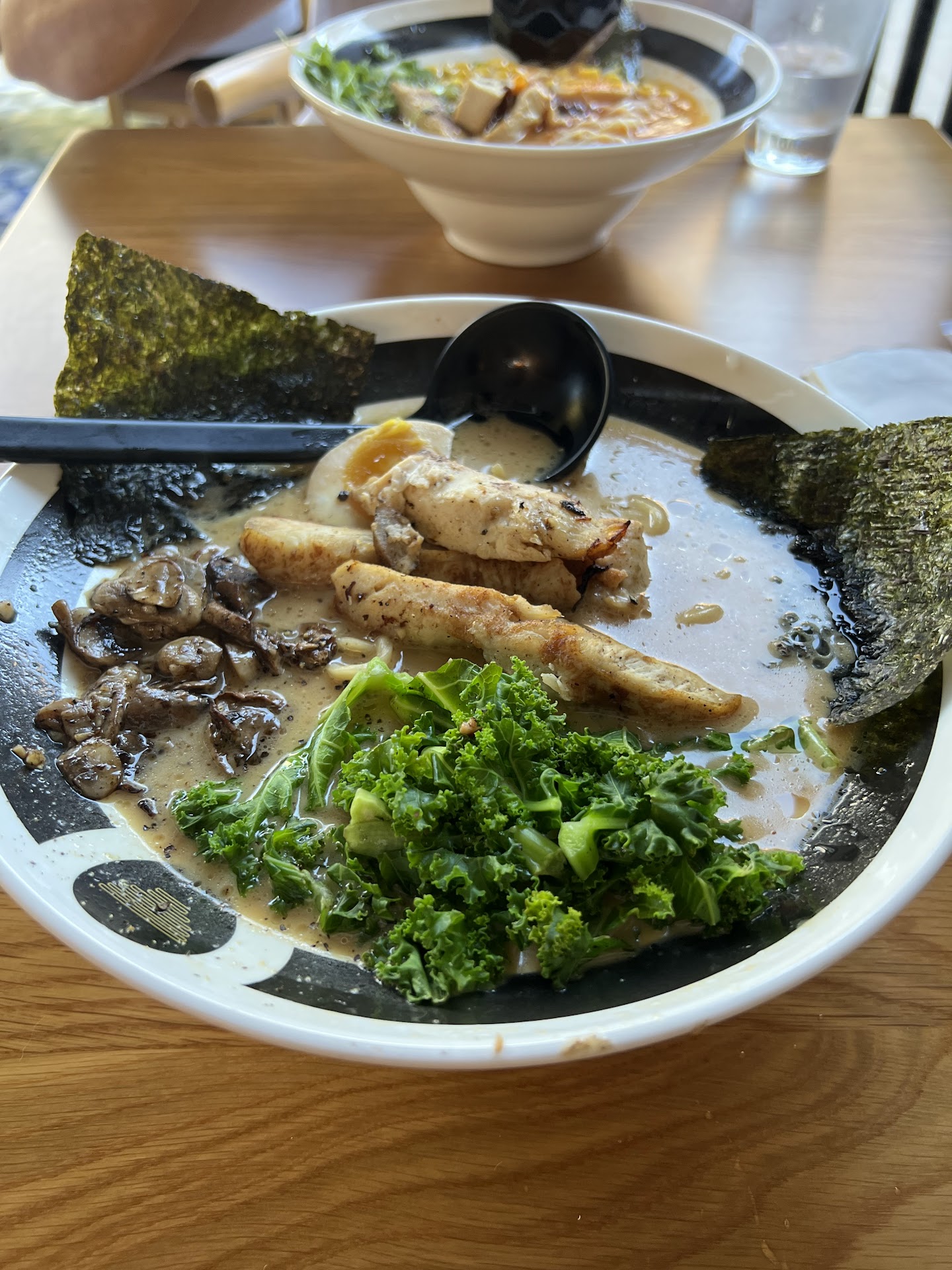 September 18, 2025: Food: The ramen here is really the thing to come for. Tonight I opted on the Chicken Karaage Curry Rice Bowl which was good with a spice level that was enjoyable, but there was no pickled ginger condiment to be added. I had to order a side of pickled onion ($1.75) so I had something to cut the fat of the curry base. All curry dishes need a pickled condiment option. The Classic Tonkotsu Ramen was great as always with good noodle pull and tasty broth and ordered as a combo with a Chicken Karaage appetizer that has a nice mayo based dipping sauce. Very enjoyable. The Rice Pork Bowl was also very good and was a good option for a smaller appetite with a great price ($8.75 for a small). I also had the Spicy Garlic Edamame which was addictive. Love the Edamame!