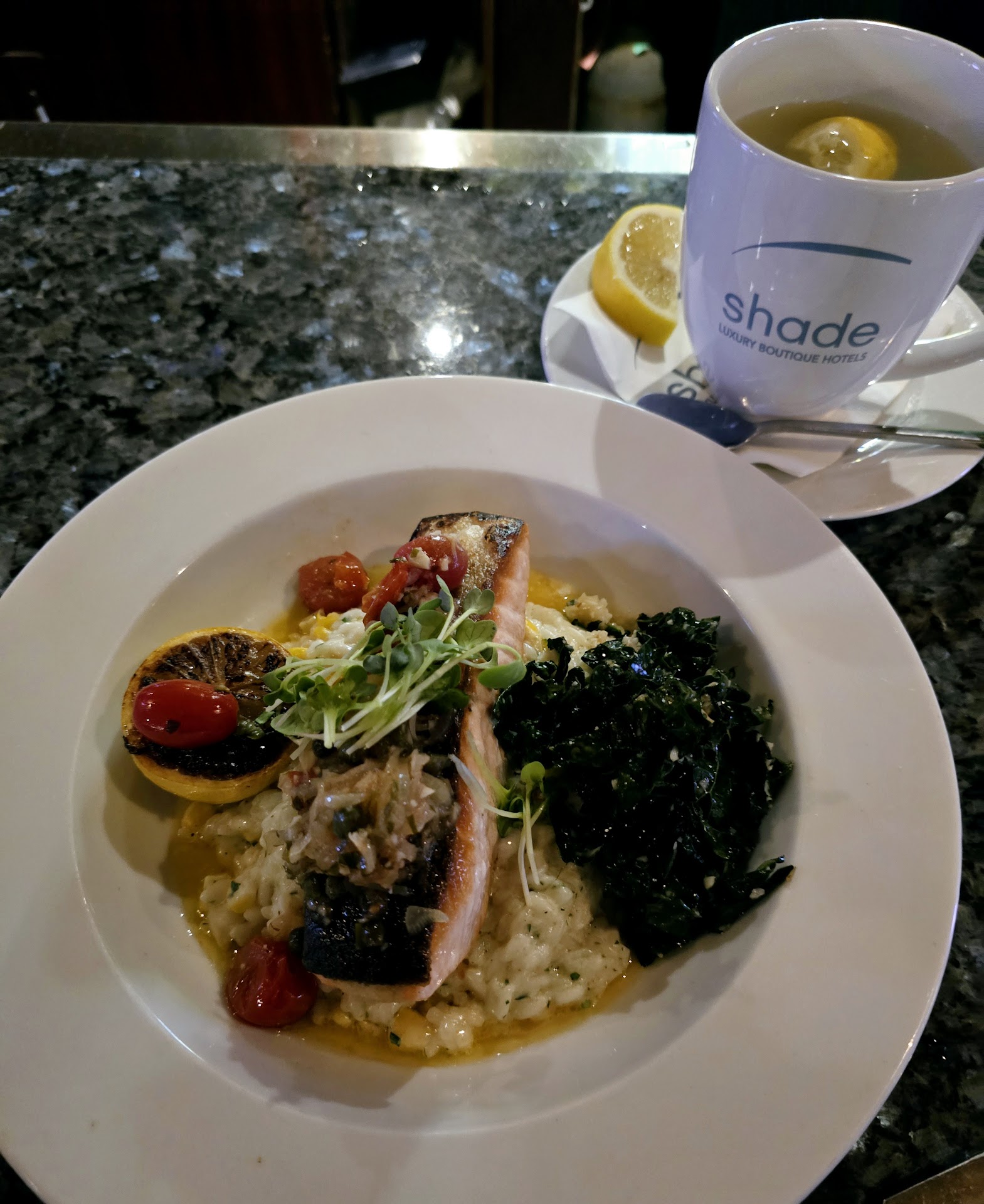 The Pan-roasted Scottish Salmon was succulent and scrumptious! The serving size of the salmon was very good. The texture was tender and the meat was juicy! The wild mushroom risotto was heavenly!