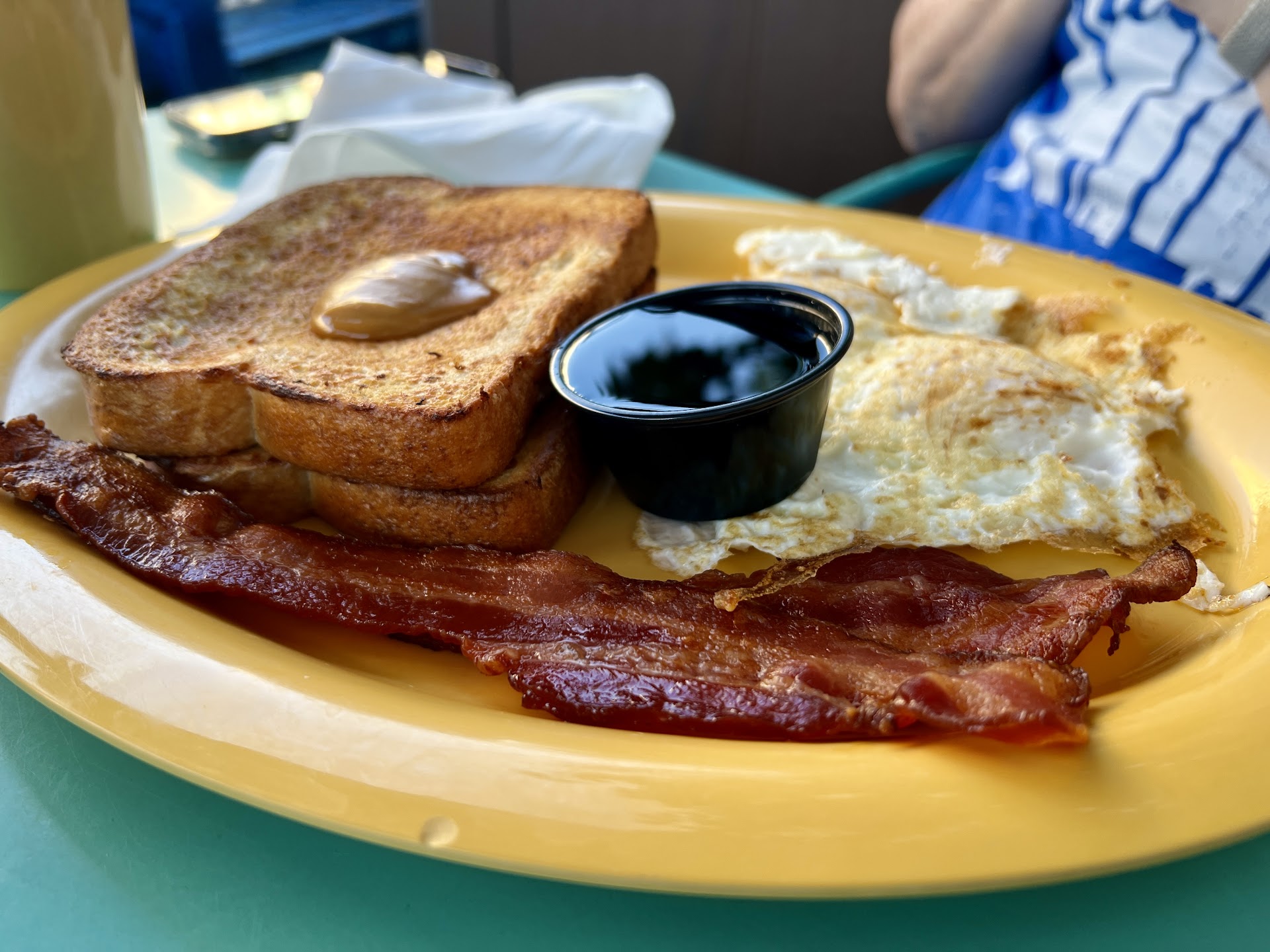 Now it's time to order. I order a coffee and cranberry juice, my partner orders a soda. It takes a while for the drinks to come out. I pour my cream in and a packet of sugar. Oh, no spoon. After some time, the wait staff comes back and I ask for a spoon. They don't come back for another ten minutes with the spoon. Weird. We order our food. I get the smoked salmon Bennie and a fruit cup. My partner gets eggs, bacon, toast with jam. We get our food about thirty minutes later. The salmon bennie was nothing special. The hollandaise sauce lacked so much flavor. Salmon was not the best. The eggs were cooked nicely. The potatoes were very peppery and looked sad. My food was not hot but warm. My partners food was just what they ordered because how can you mess up on eggs, bacon and toast?