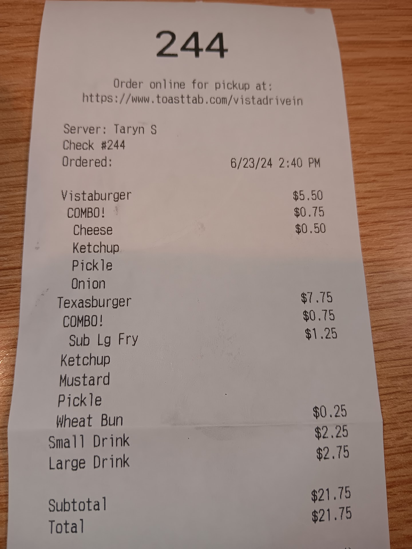 Read moreSo I love to eat here whenever I'm in town. The food is always consistently good. But today the young man that waited on me was just rude and acted like he had a problem with me because he asked me if I wanted to dine in or out. First I said dine in and quickly realized I didn't have as much time as I thought I had. So I said I'm sorry change that to go, but he had evidently already entered it for dine in. He got frustrated and showed his irritation to me and started to lay his head down on the counter. So I said hey, no worries, leave it for dine in. I can still just take it with me. Because I didn't want to be the cause of his frustration. But he looked back up at me with a very nasty look of disgust and frustration on his face. So I told him you look like you have a problem, I told you to leave it as dine in. It's not that big of a deal. He said in a negative tone, I dont have a problem. So I said we'll DONT have one with me. Out of my own irritation at the situation. So, I love going here and have never experienced this type of service before. But I post this so hopefully the owner will be aware and coach this young man...