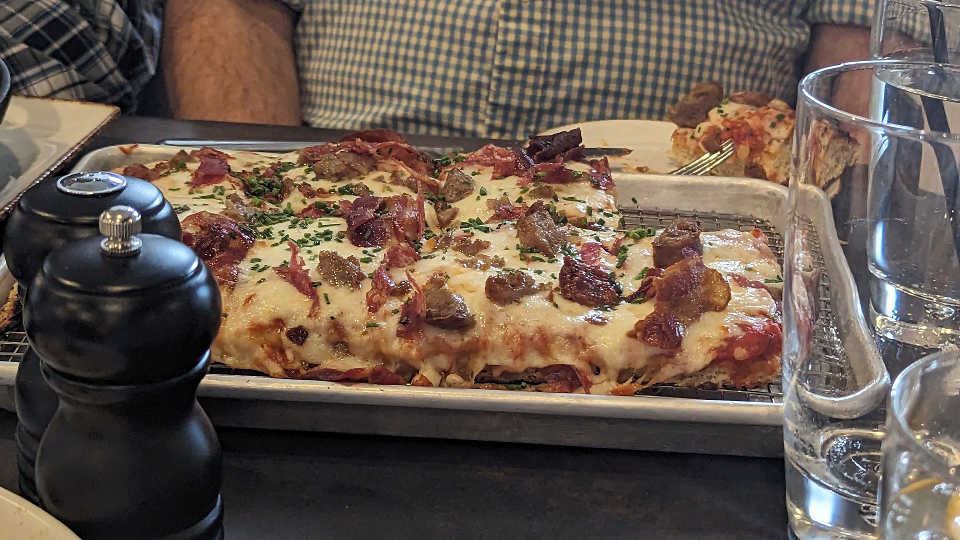 The food that we ordered was really good and tasty. My kids ordered chicken tenders with fries and grilled chicken with a side salad off the kids menu. My husband and I ordered the pizza Classico and a Greek chopped salad which we enjoyed. The pizza was large enough to share with our children. The food came out quickly enough too.