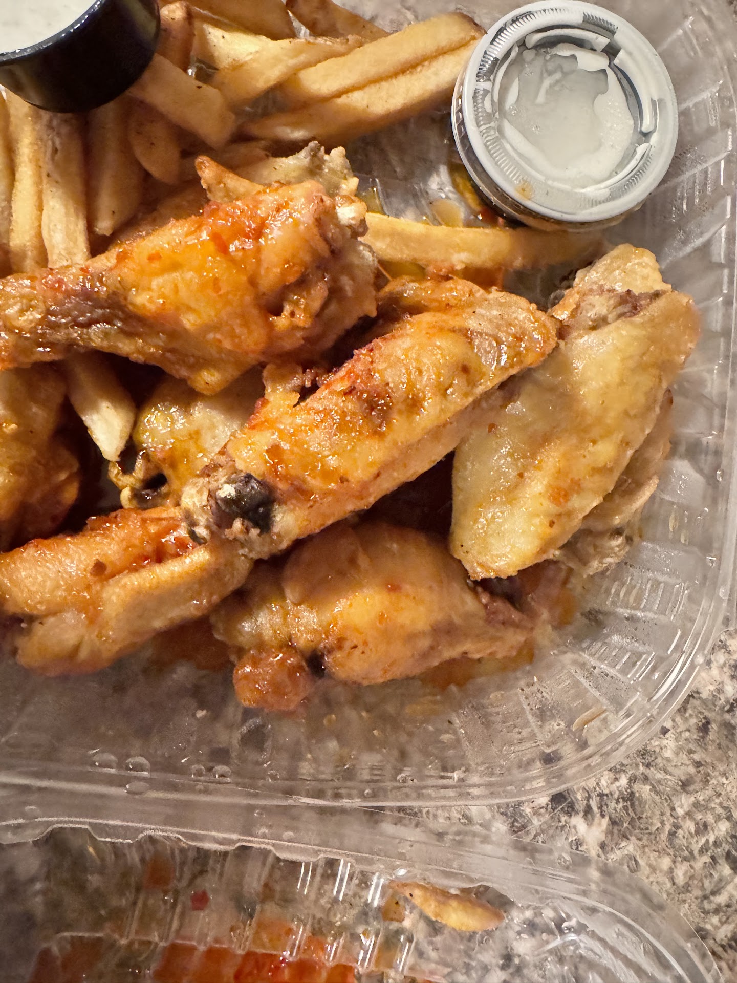 Read moreI wish I read the reviews before ordering here. I don’t even know where to begin. Fries tasted old. Quality of the chicken u could tell was low. Soggy wings, not crispy at all. I didn’t know it was possible until now. Barely any sauce on the wings. Despite the fact that I ordered 4 different sauces they all tasted the same. One of them was garlic Parmesan and I am convinced they forgot because I did not see, taste, or smell any garlic Parmesan. Back to the soggy low quality chicken. Literally gagged biting into one. It had the fat in the meat which along with the sogginess felt slimy and gross. What a waste of money. Please believe the reviews and don’t order here. Didn’t know it was possible to mess up wings but here we are 🤮. Also why were they pale?! I expected that rich golden color with sauce. Maybe they were not cooked long enough? I would give 0...