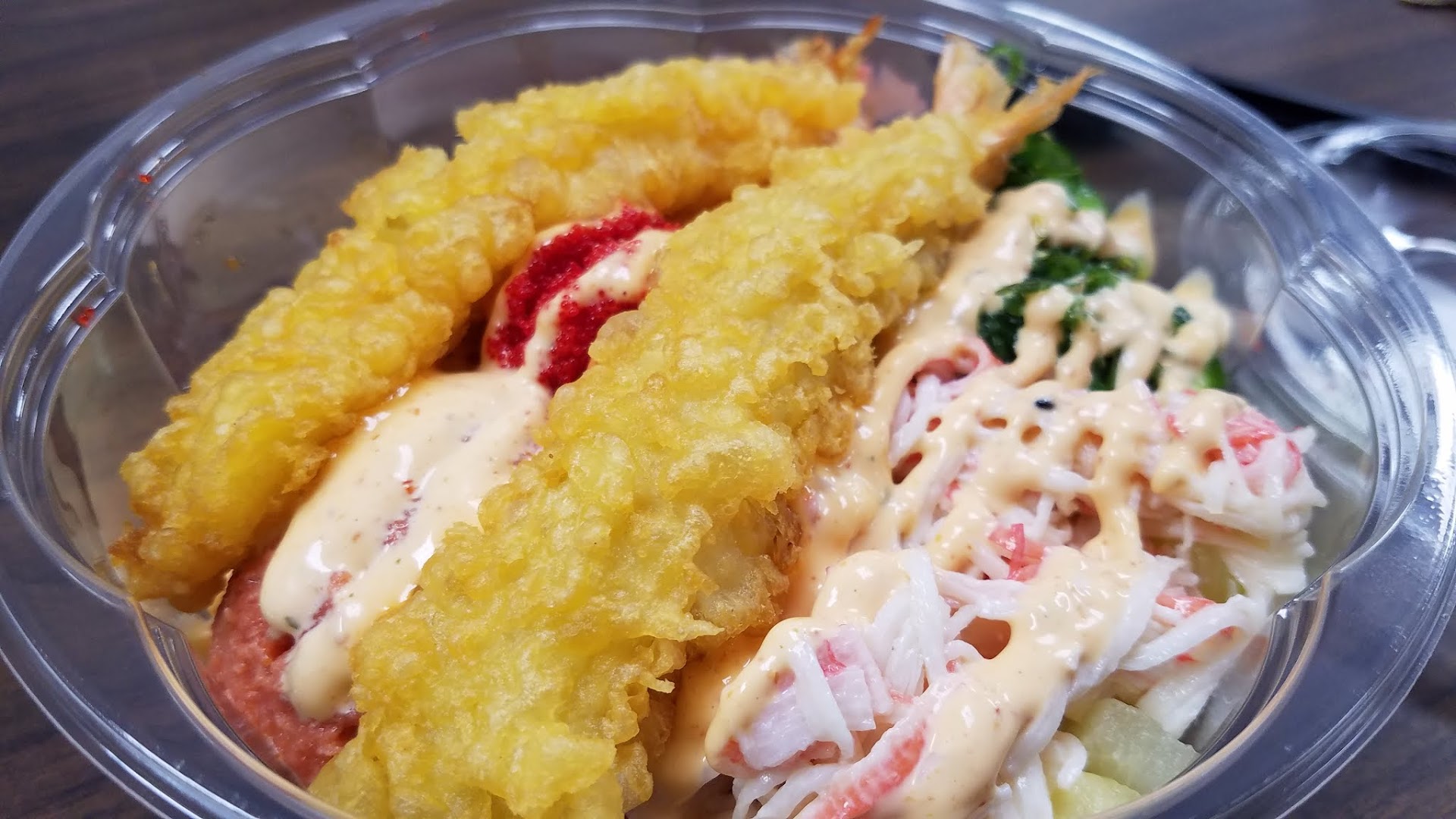 This is a 'subway' style restaurant in which you start with a bowl of rice (or salad) then pick your proteins and veges down the line. There are tons of different combinations ranging from Tuna, Salmon, Shrimp, Eel, Tempura, Crab salad, and more, to corn, carrots, seaweed salad, ginger, jalapenos and so forth.