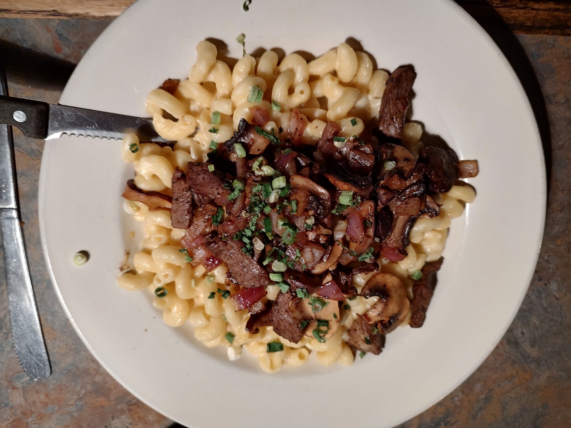 Food was mediocre at best. The $34 New York strip steak de jour was recommended by the waitress and was suppose to be topped with melted Gorgonzola cheese. When the steak came out, no cheese was on it. Waitress took the steak back to kitchen and cheese chunks were added then the steak was held up to a heating lamp. We watched this happen. The cheese was not melted.