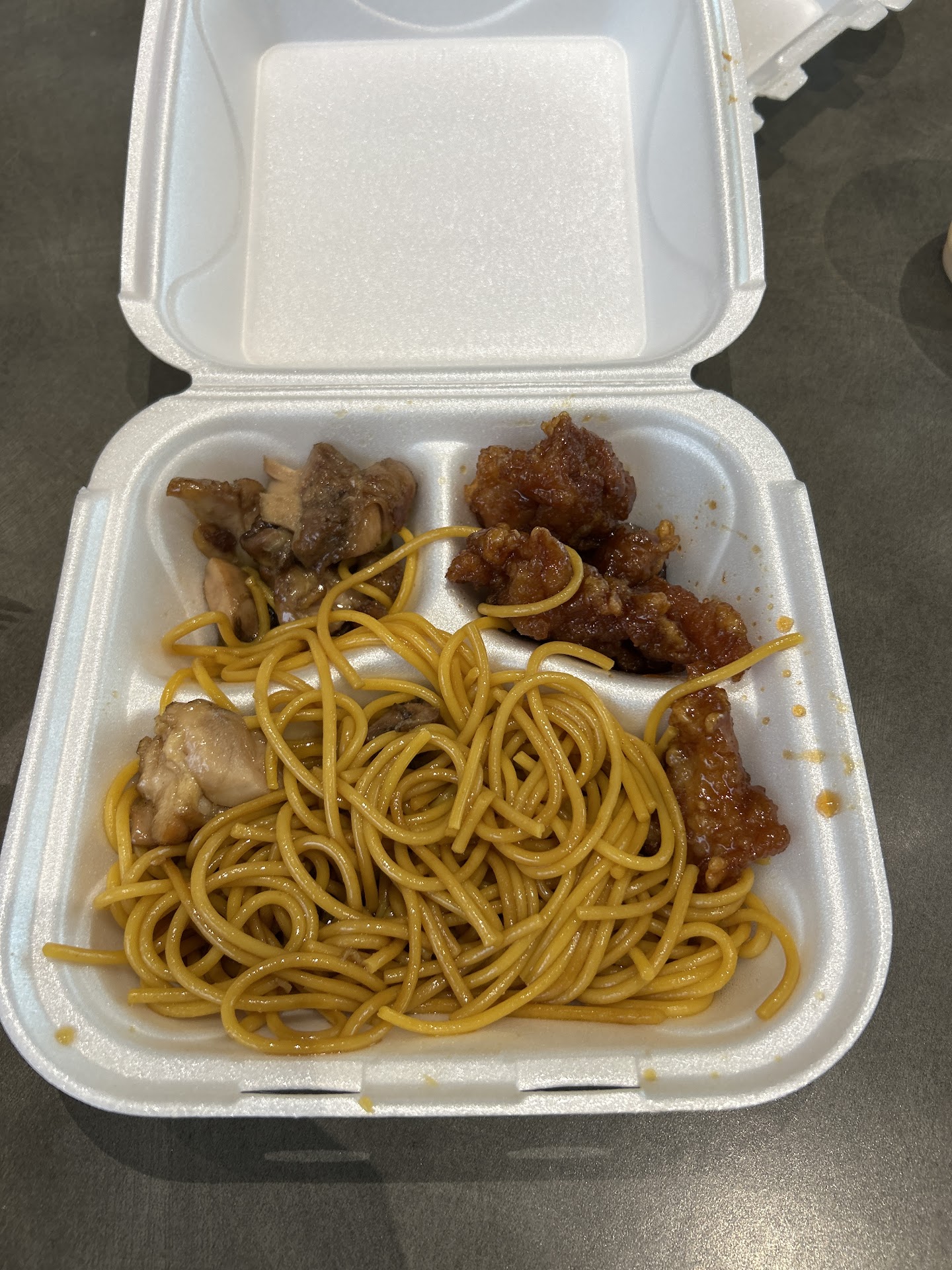 We ordered the 2 entrees platter and they had a ton of the orange chicken left about half an hour before closing, they gave us 1 scoop for each entree.. there was about 5 pieces of chicken in each scoop which was very disappointing. We got the noodles as well and they werenât the usual egg noodles lo mein usually has, it was spaghetti noodles and did not taste like lo mein, there was no vegetables in the lo mein which we prefer but Iâve had lo mein without vegetables that had more flavor and I honestly think my grandma has made better ones at home. The cheese wontons were pretty good and the guy working with the lady seemed...