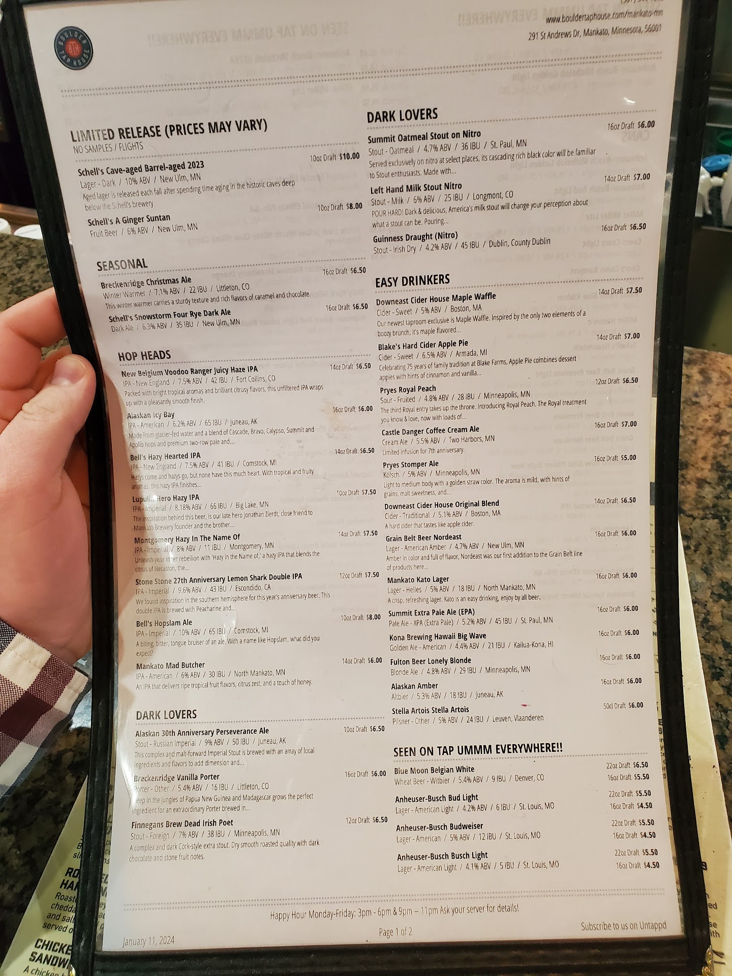 First time at the Boulder Tap House & We were not disappointed. The atmosphere is nice. Lots of screens to watch various sports going on. I really appreciated that they were showing more than just football. Our food was very good. I had the Minnesota Sushi & the Tequila Lime Chicken tacos (pictured) and both were great! Lots of flavor. The tacos came with their beer 'battered' French fries which were well seasoned. My adult son had the Western Burger which he said was great as well. My son tried their Banana Bread Old Fashioned and was pleasantly surprised that it was very good; not too much banana liquor like he was afraid there would be. I tried their Pomegranate Mule & that was very tasty as well. We were with a larger party for a little family/cousin get together (there was only 9 of us). I gave only 4 stars for service because while our server was very nice & joked around a bit, the table was not cleared of dirty dishes and got very cluttered very quickly and at times it felt like he really wasn't too thrilled with dealing with a larger group. But...that will not keep us from going back if we end up in Mankato again. All and all a good experience.