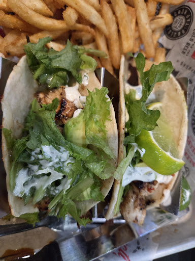 Read moreWe had heard good things about this place, specifically about their burgers and their alcoholic teas. Both true! We visited on a Saturday around 5. We did not have to wait and were seated in a booth right away. Our server was excellent and very attentive. Our food was delicious-- carnitas tacos, mushroom burger, sweet potato fries--all very good. The inside of the building was not at all what we expected. The outside makes it seem more upscale than it is. The inside is reminiscent of my grandparents' basement with the dark paneled walls, old carpet, and tired furnishings. Everything was in need of a good deep cleaning. I cringed as I watched a toddler crawling on the carpet! The ambiance pretty much consists of a large collection of taps, large screens all on different channels, and 80's music playing in the background. It's definitely a loud place. The menu had several fun options we will likely try out in the future, but probably via takeout, which seems to be a pretty streamlined operation here with a shelf just inside the door.