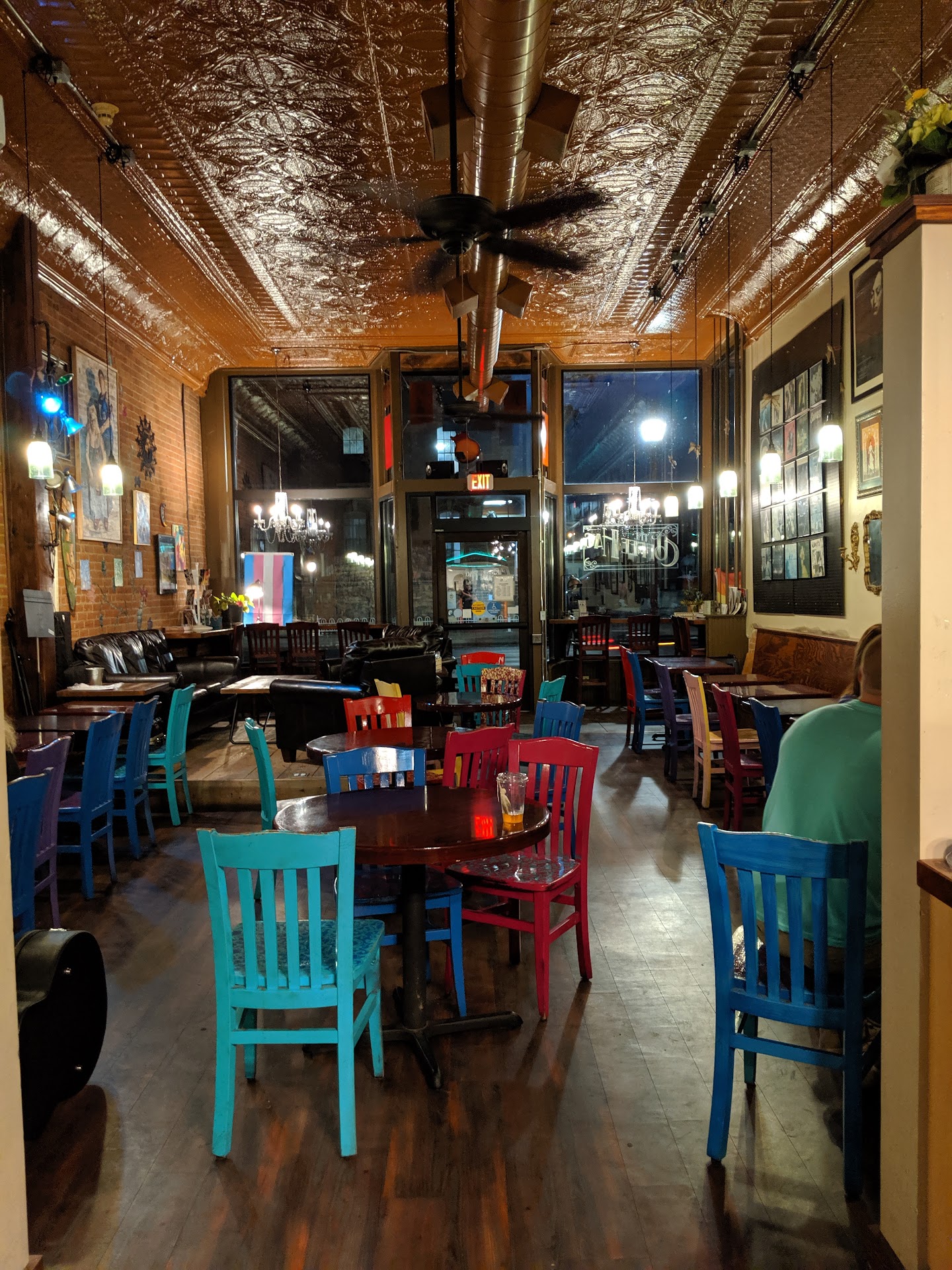 Cozy. Staff are very welcoming and open to first timers. Easy to find somewhere to sit. Grounded electrical outlets everywhere, so you don't need to move to charge a laptop. Coffee is very good and professional made. The building is very clean and well kept, both inside and outside. Open mic is very fun to watch. Anyone can participate, whether or not you are a musician. Open mic invites everything and everyone from musicians singing for the first time on a stage to live poetry readings. Overall, I feel that it is one of the few places where I genuinely feel welcomed and accepted. It's a great place to sit and relax to a good book, it's great for when I need to go somewhere to get some work done during the day, and it's great for when I want to listen to some awesome people...