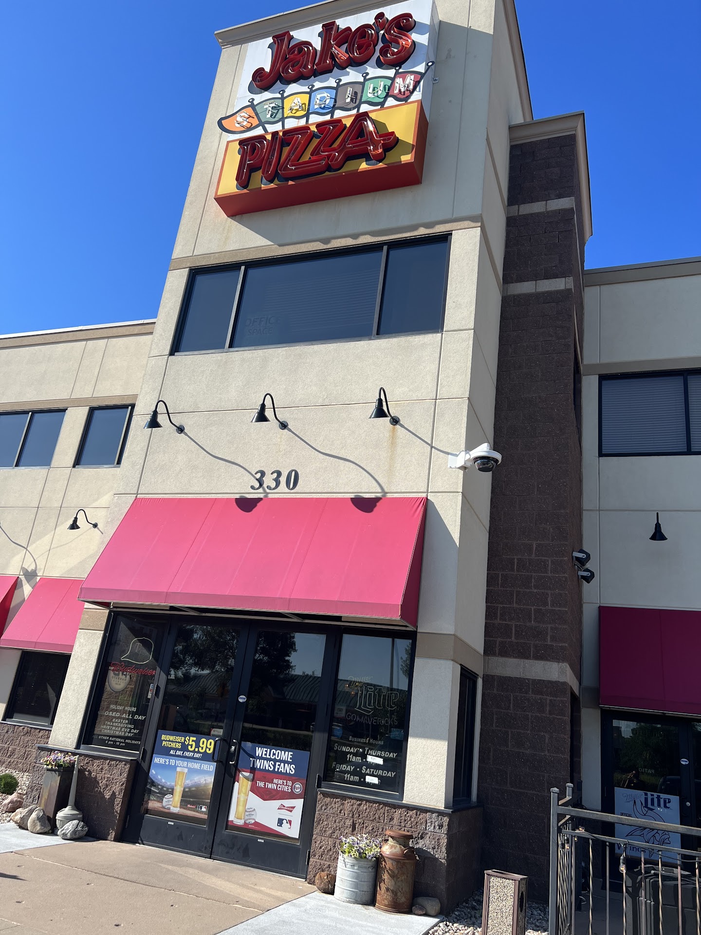 Read moreSo, we heard that Jake's was the best pizza (or restaurant, for that matter...) in Mankato... Well, I'm going to attempt to restrain myself here, and just give the facts of the matter for our out -of-the-way visit to Jake's Stadium Pizza. Ordered a medium 4-meat pizza. Sat down in the relatively empty, i guess Stadium. Once our pizza was ready, called out over the intercom, i sauntered on up to grab it, noticed it to be white in color, asked politely for additional cook time - no problem. Went up a second time to grab the pizza, looked exactly the same. No matter. Sat down to eat, and discovered nothing good, honestly... Pizza was, and i promise I'm not exaggerating or being unfair here, the most awful attempt at pizza I've yet encountered... I'm sorry, guys, sorry Jake, but it's true, unfortunately. No sauce, like at all, not much cheese, but whatever cheese was just barely melted, even after the extra cook time, i never did discover any pepperoni, and here's the clincher: so Jake must think it's a good idea to homogenously mix ground beef from the taco pizza in equal measures with sauce, because that's what was delivered, and i have to say, no. No, sir, no. The flavor was un.... ummmm, untasteworthy? Unforgivingly unfortunate? Awfully not good is about all I'm able to report at this time. Much as i am loathe to do it, i must inform whoever's reading this review that i cannot get behind Jake's Stadium Pizza. Not now and not ever, and i hope they gave the remaining 9/10 of our 4-meat pizza attempt to a nice unfortunate person in the area - i left it in the to-go box right there by the beverage station. On the plus side, however, the establishment was clean, employees relatively nice, so there's...