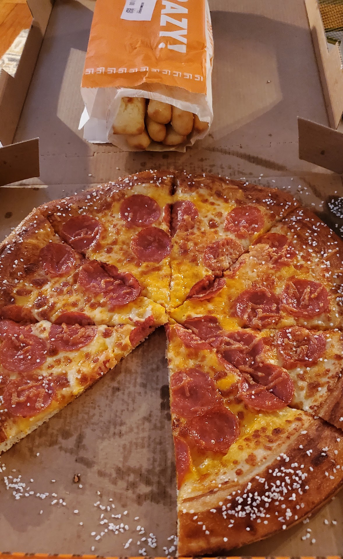 I went on a Thursday at dinner time, my mistake. I ordered a pepperoni pizza and cheese bread, I had to wait, which is fine. There were 4 people in front of me. We all watched as the next 6 people came in with other simple orders like ours, get their pizzas in front of us and walk out the door. All 4 people in front of me had to ask about their pizzas and then got them right away when asking. So I followed suit after a 16 min wait and watching 4 of the exact same order as mine walk out the door in front of me! The manager seemed to be the only one in front working (and he was actually working really hard to clean up what the girl at the register was doing). The pizza was hot and exactly what you would expect from Little Caesars. The wait and weird order in which they served customers is what is going to keep me...