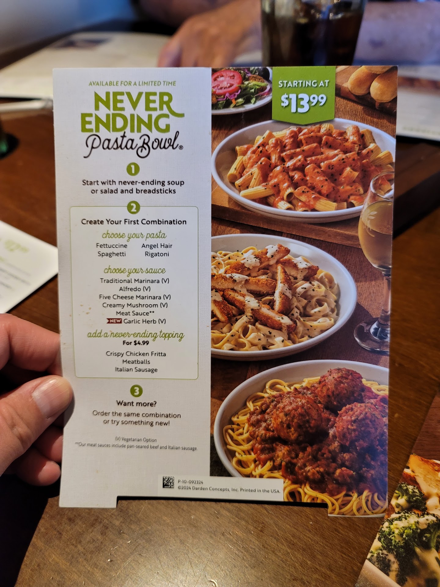 Read moreI went to this Olive Garden on 02/26/2022 and the overall experience was NOT GOOD. There was about a 30 min wait which was no big deal. The place was extremely overcrowded and it was difficult to even walk to the rest-room, however once we were seated it didn't seem like an issue. Our waitress was super nice and we got our food and drinks promptly. That's when everything took a turn for the worse. As soon as they set the food down in front of us my sister found a hair in her food! She also recieved the wrong order. She ordered the shrimp alfredo and recieved the seafood alfredo instead. She told the waitress three times there was a hair in there. The waitress took the order back and came back out with the SAME PLATE. They just scooped out the scallops and the hair out! My sister even asked "is this the same plate?" to which the waitress replied, "yes, we just took off the hair because it was a surface hair and we took out the scallops". I don't know if this is what other restaurants do, but we were completely appauled and disgusted. We then continued on with our meal and found three more hairs in our food! We didn't even complain again because of how they reacted to finding the first hair. Plus after finding the first hair our waitress was no where to be found. We tried to pay on the tablet machine and it would not work. She then brought us paper reciepts and was unable to split up our bill correctly after we told her and she corrected the reciept multiple times! We spent an extra twently minutes just having her try to fix our reciepts it was such an inconvience and bit frustrating. My sister also got charged for the more expensive meal (the seafood alfredo) that she didn't even order and had a hair in it! She had to complain to the waitress TWICE before the waitress talked to the manager to discount just...