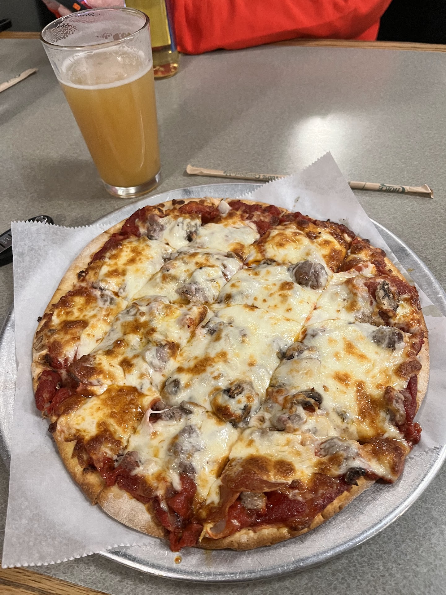 Pizza, it's right in the name. This is a down home, I don't want to say divey, pizza joint. The atmosphere is cool. The lighting is lower, the booths are big, and if you're observant enough they even have an old Mrs. Pac-Man cabinet hiding in the back.