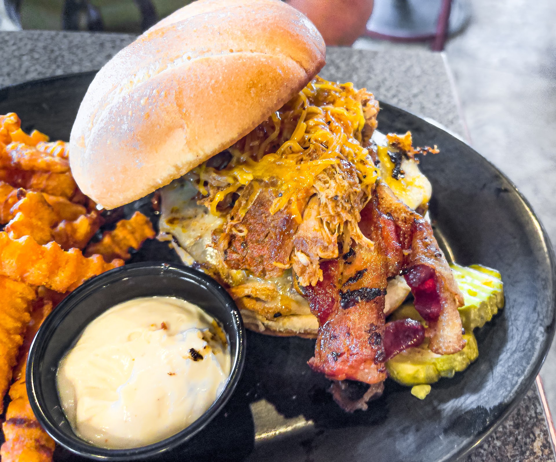 Artichoke Spinach Dip 🧀 house recipe served with pita bread ——— Why do you put three kinds of meat on the same sandwich? Bar-be-cause why NOT! 😆 My culinary companion had no complaints, just compliments for this handheld. He liked the smoky, fall-apart flavor of the pork, along with a lil’ burger and bacon for a robust meal on a bun 💯