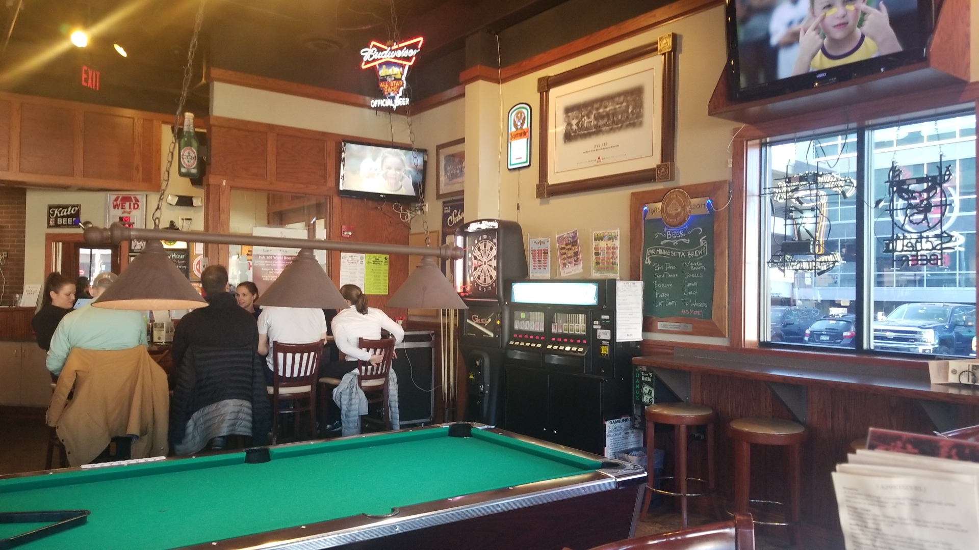 I stopped in for my first visit to watch the Vikings/Packers game (Skol!). The restaurant/sports bar 5 TVs on the wall (I think that is correct), ranging from 30" to around 44"-46". One larger 2 tvs were at the seated bar area which large and sits in an oval.
