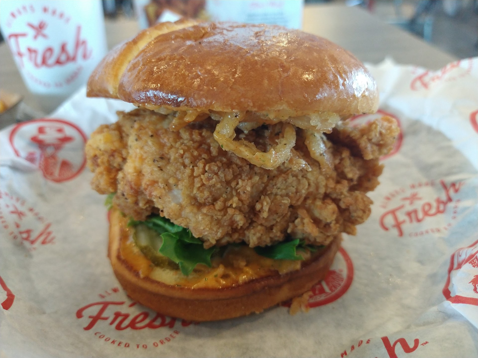 Read moreI can't believe my mouth! I'm sitting here during a crazy busy time, comparing this to the likes of Chick-fil-A and Cane's. • Food: Starting with the chicken, spectacular! This is a very thick, well-seasoned chicken breast that's super moist and perfectly crispy. This is where most restaurants err by failing to give the breading flavor. Slim's nails it. I went with the Cayenne chicken which was nice and spicy, but not too hot. Frankly it tastes like it's beer breaded which is just fantastic. Complimentary sauce that gives the kick, FRESH, crispy premium pickle slices, soft brioche bun, crispy friend onions. The fries are reminiscent of Five Guys. Fresh cut, natural, crispy and tender, slightly thinner. The mac n cheese is VERY cheesy! Definitely tasting three different cheeses in there. Noodles are just a tad overcooked, but it's hard to hold mac n' cheese long without getting that result. • Drink: I beelined to the lemonade and was glad of the decision. This is frozen FRESH, not concentrated shelf stable junk. Perfectly sweet, yet not cloyingly sweet like Chick-fil-A. Next I tried the peach tea. It's good, also not too sweet, fresh peach taste, not a really dark black, more a moderate strength. • Options: Almost too many, but I'm glad for the variety. Keeps it from being boring, yet not confusing. • Customer Service: Again comparing to Chick-fil-A, stellar customer service. Staff constantly coming out to the table to check on you, give refills, offering to-go boxes, and ensure satisfaction. Keep it up! • Speed: For as busy as they were, the speed was quite good based on the food prep. Took about 6 minutes to get my order. • Price: Not as much as a regular sit-down restaurant, on par with restaurants of similar design. Naturally I wish it was a bit cheaper, but the value is strong based on what I've experienced. • Final: This is my first visit and I very much look forward to future ones. Couldn't be more happy and I can't wait to try...
