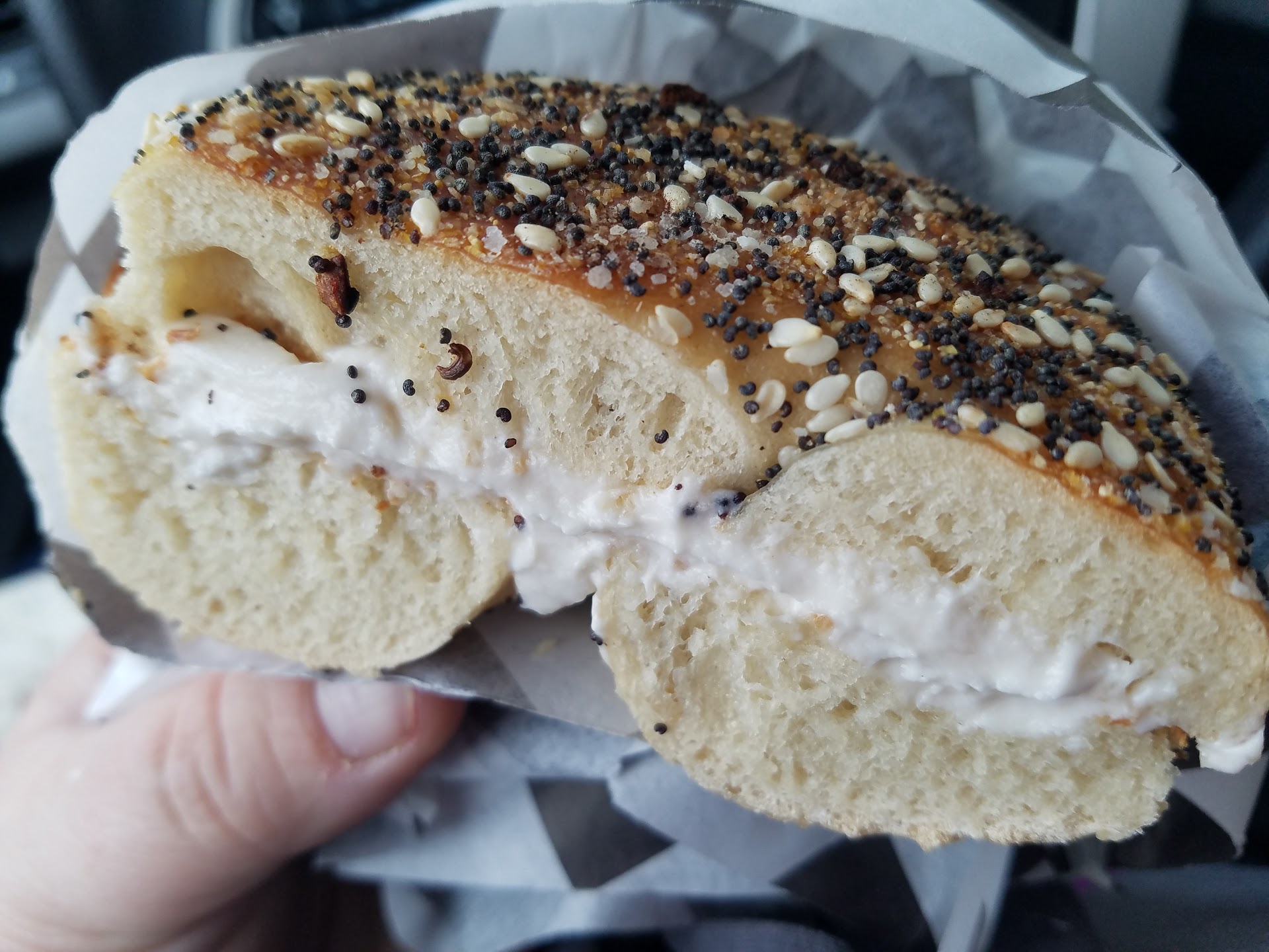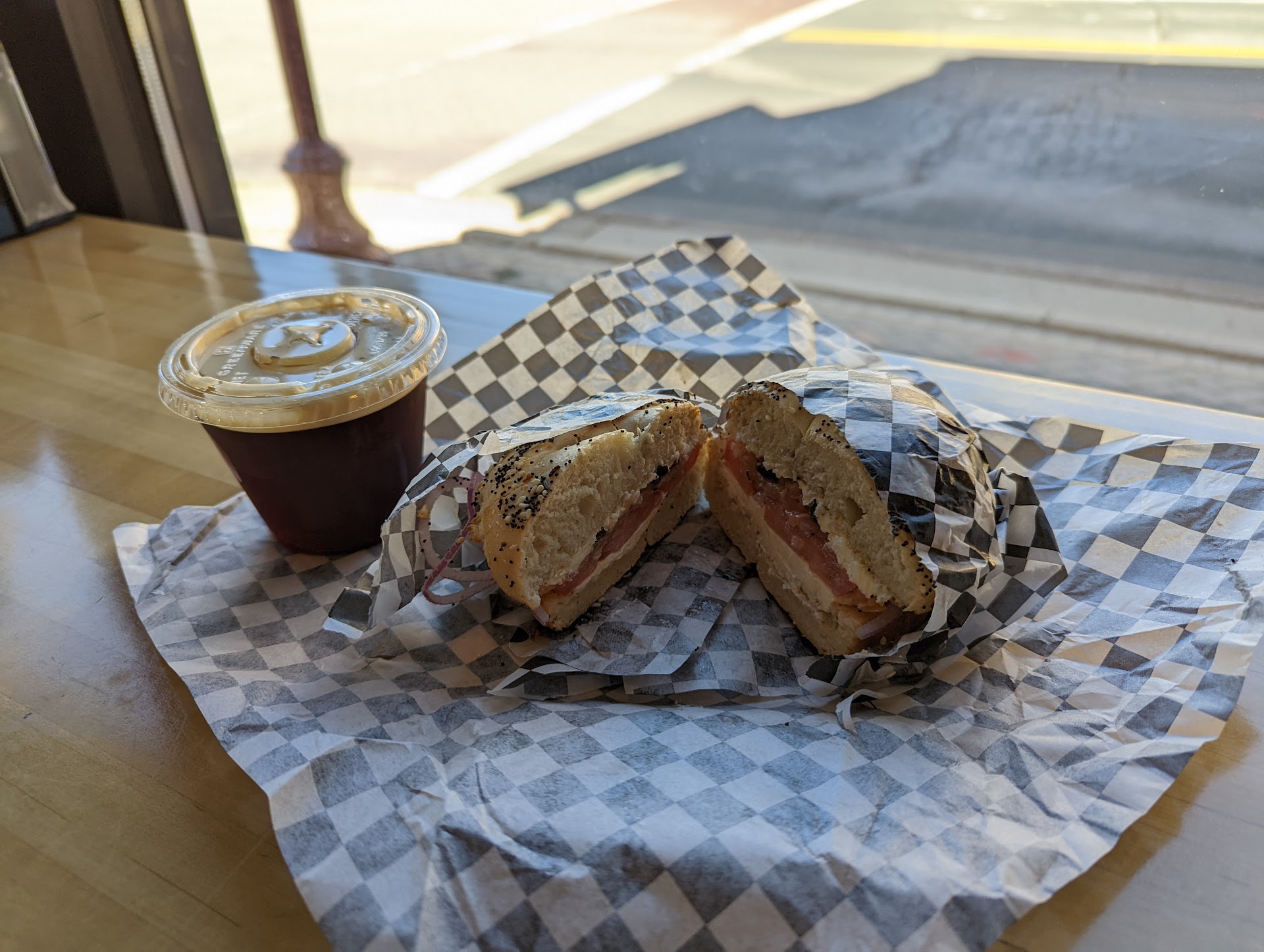 Read moreThe service is always friendly, even when they're busy. The coffee is excellent, and their monthly drink specials are worth checking out, even if you don't normally drink flavored coffee. Their salt and onion bagels are my favorites. Typically, I get some bagels to take home, but I decided to get breakfast in store this morning. I got the simplest option, the egg and (pepper jack) cheese, on a salt bagel. With any simple dish, the quality of the ingredients and skill in preparation make all the difference, and in this case, it was perfect. The eggs were soft and moist, and the cheese was melted throughout them. The salt on the bagel was just right to balance the creaminess of the eggs and cheese. I ended up sitting on the bench outside in the cold and eating the whole thing because I didn't want to wait...