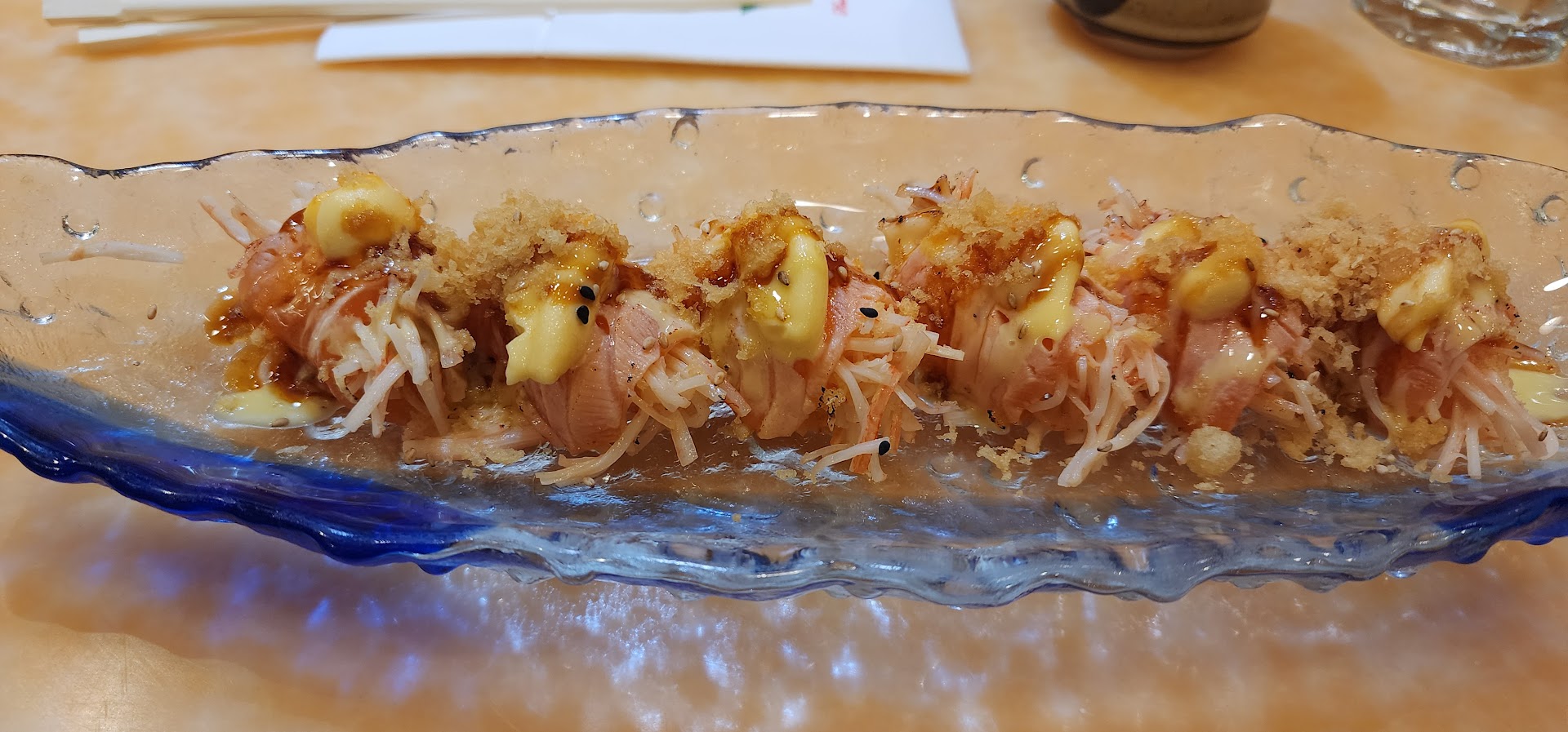 Mankato Roll 🍤 with Fried shrimp, cucumber, spicy tuna and crunchy on top, served with eel sauce and spicy mayo