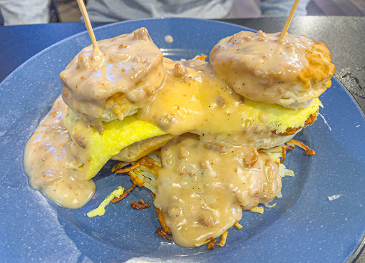 The Brunkie 🍞 Fresh baked biscuits, sausage patties and eggs, on hash browns covered in gravy