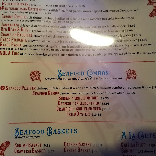 The overall impression of the place is that, as others have indicated, they have some issues they need to addressed but the food overall is ok. First the good parts: The fried shrimp was tasty and not fishy at all. I liked the light breading on the fried shrimp but it did tend to fall apart. The red beans and rice was a bit bland but over all had good flavor. The dirty rice had good flavor but was a bit salty (and I like salt). Therefore, I could not eat very much of it. The side salad was very uninspiring. It came with exactly 3 croutons a few pieces of cucumber and a couple of slices of tomato. Without a lot of effort, the salad could be greatly improved. Now for the issues. They have a major issue with parts of the menu. They list 3 salad dressings: Ranch, Caesar, and Cajun Basil Vinaigrette. When I asked for the Cajun Basil Vinaigrette on the side, we were told it is really Balsamic Vinegar. The section of âSeafood Combosâ is very confusing. So confusing that the server could not explain it and got it wrong when she did. The top heading is called âSeafood Combosâ which has a notation that it comes with a side salad, 1 side and fresh toasted bread. Directly under are several options: Seafood Platter, which includes shrimp, catfish, oysters etc for $16.99. The 2nd option is the Seafood combo- where you get to choose two meats (shrimp, oysters, catfish, or crawfish) for$13.99. Or you can get one of the 4 platters for various prices. When we asked for the Shrimp platter, we were told we HAD to pick two and could not just pick one seafood option if we wanted the side, salad and toast. To make matters worse we did not even get the âfresh toasted breadâ with the Platter. We ordered a side of dirty rice. When the bill came, we were charged $3.50 for the dirty rice side, which does not match what the menu lists of $3.25. Now of course .25 cents is not a big deal. It is more of the principal. When we asked about it, the server shrugged and said well that is what is in the âcomputerâ. Therefore, I guess if you thought you were getting an item for $10.00 and the âcomputerâ charged you $20.00 that is just the way it is! I am only adding this extreme example to prove a point, as there was not that big of a discrepancy between the menu and the âcomputerâ for what we ordered. I can see that this could be an issue with larger parties. You should carefully read your bill and compare it to the prices marked on the menu! They should probably make sure the âcomputerâ matches the prices on the printed menu. I think this restaurant has some issues to iron out but it has potential as long as they fix...