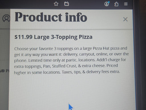 Called the store 2x, one time to say a pizza was missing and 2nd time when we realized the one pizza we got did NOT look like a pan pizza. A man who worked there argued with me how it WAS a pan pizza. I told him it looked like a hand tossed pizza. He repeated no, it was pan. This a night before Christmas Eve…. I said, I have one pizza missing, the other does NOT look like pan, I know the difference (I felt insulted I’m having to defend myself) He made it clear he would replace this at the expense of the store…. Uhm YES you should be, I don’t need to be told as if “I don’t want to do this, cuz I’m right and you, the customer are wrong” attitude.
