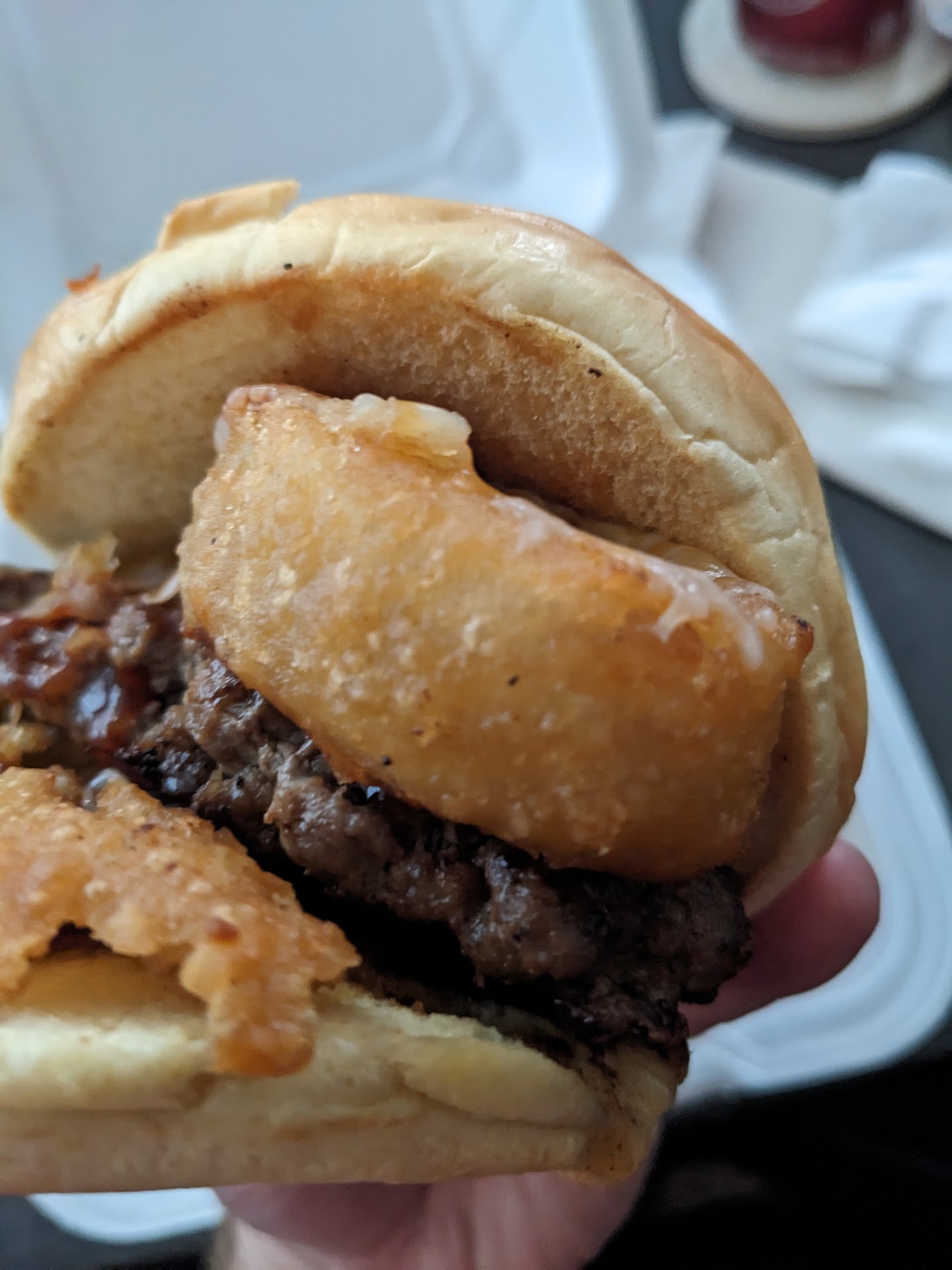 I ordered a cowboy burger and seasoned fries. The cowboy burger was really good. I liked the barbeque sauce a lot. And the onion rings on it were huge and had a lot of flavor.