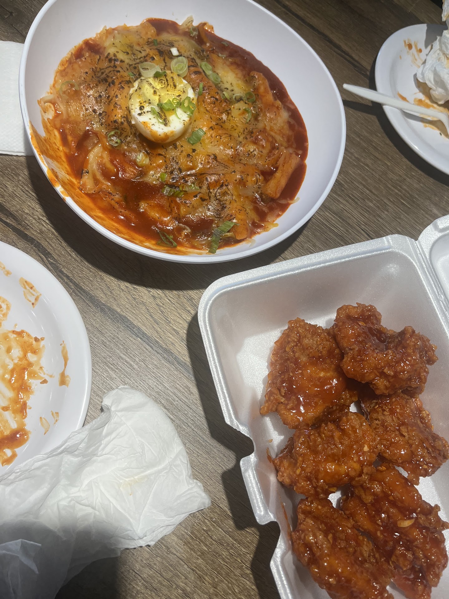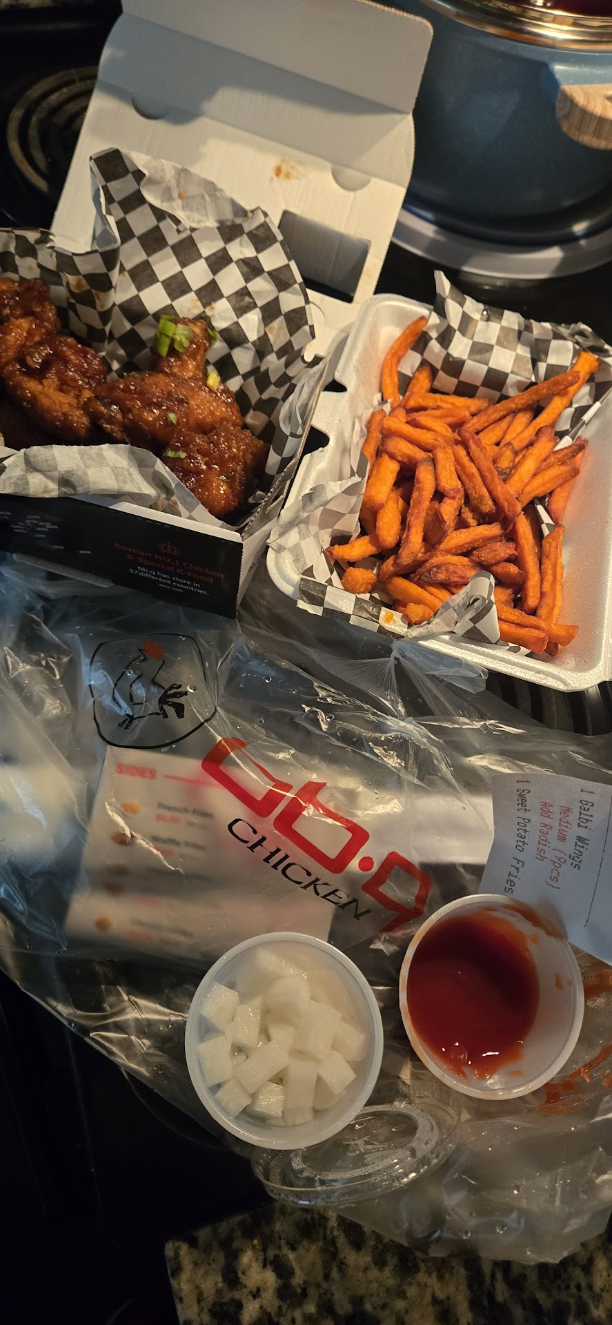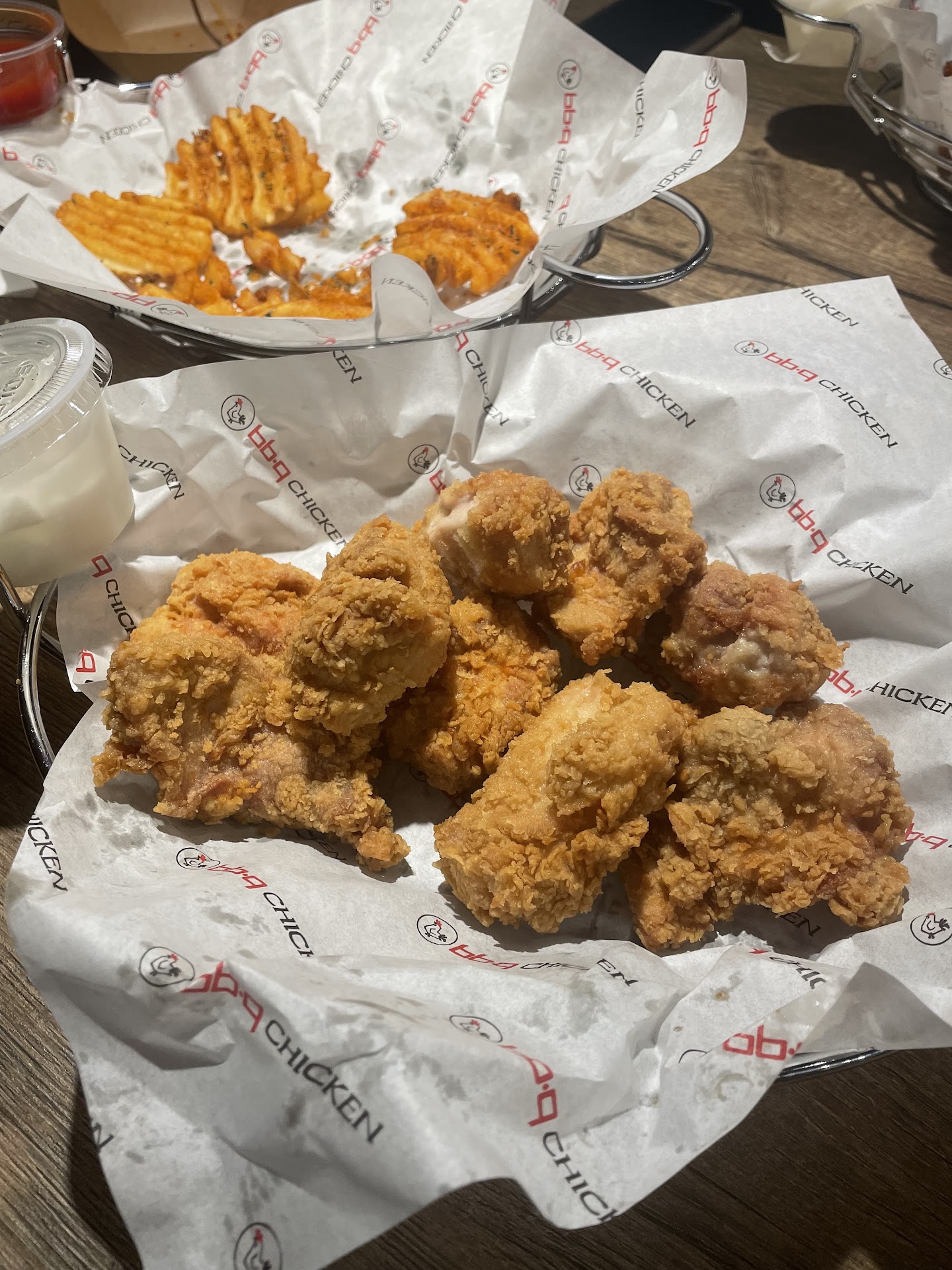 I had tried Korean fried chicken before at another restaurant in DFW (which had introduced me to this innovative new cultural style of fried chicken). However, now that I have tried the Korean fried chicken (hereafter abbreviated as "KFC") here at this newly-opened location of an apparently very popular chain for KFC, I can safely say that bb.q's KFC beats what I had before clear out of the water!! I had the pleasure of trying half/medium sizes of three of their KFC flavors-- Original, Honey Garlic, and the Gang-Jeong-- and they each were amazingly tasty and full of flavor in their own way! And the crunchiness/crispiness of the batter really felt out of this world to me. I never imagined fried chicken would have such a pleasurable crispiness, but thanks to the authentic technique and batter they use to prepare the chicken, apparently you can!