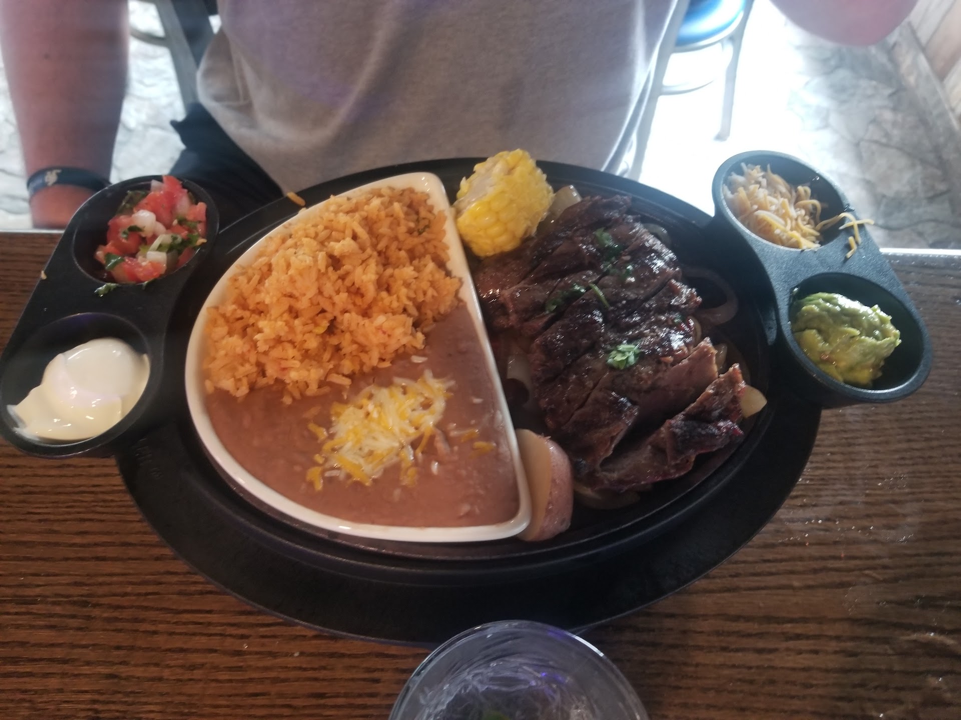 Our food came out within 15 minutes, looking stunning as ever, and I was ready to dig in. The fish tacos came with 2 tacos in a flour tortilla and Spanish rice with black beans. They tasted fantastic as the fish was well seasoned and grilled. They were garnished with a cabbage slaw and a special sauce. The steak fajitas were looking exquisite and smelt phenomenal! They came perfectly cut into strips with 2 pieces of corn on the cob and a redskin potato. They were garnished with green vibrant chopped cilantro laying beneath a bed of thinly sliced caramelized onions and red and green bell peppers soaking in the beef drippings making it flavorful than ever! Along with the beef fajitas came sides of freshly made guacamole and Pico along with cheddar and mozzarella cheese and sour cream. Beneath the sizzling dish of fajitas were soft and warm flour tortillas waiting for you to stuff and dress them properly so you can eventually devour them.