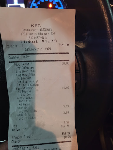 Read moreI live more than 30 Minutes from this store and sometimes I will stop on my way home from work and grab dinner. So if my order is wrong its not an easy turn around to drive back to the store to correct it. This is the second time in two weeks this KFC store has messed up my order. The first time was my fault. I ordered the new boneless chicken in DARK meat. When I got home it was white, So it took a one hour total round trip to correct my meal. The second time I went inside and told the clerk 3 times I wanted dark meat boneless. After the clerk made the meal I checked it and low and behold it was white meat AGAIN. I went inside and told the clerk my order was all white and I ordered all DARK meat. He actually argued with me and said I was wrong. I showed the clerk it was white and all he wanted to do was aruge so at that point I left and when I got home and took a bite it was all white meat. I called and called the store and no one will answer. When I called on its sister store to ask for the district manger no one could tell me who the store manager was or could even give me a contact number. My favorite chicken is KFC, but I will not continue to order anything again from this store because of how I was treated and the clerks dont seem to care, there right and the customer is wrong. Why is it so hard for them to be able to tell white from dark boneless. I dont even work at KFC and I can tell the difference. KFC is not a cheap meal and my order should be correct. But this was strike two in a to...